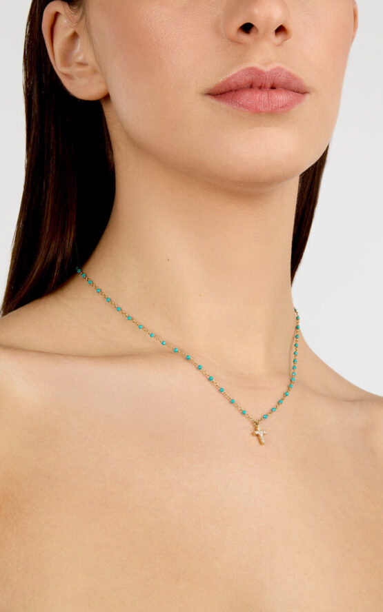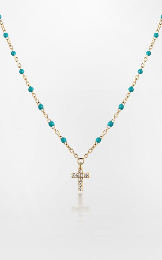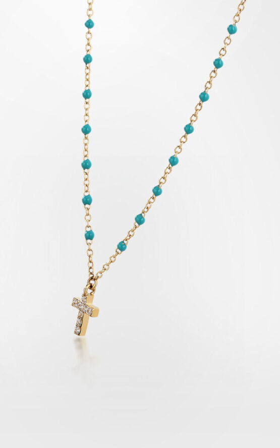 Γυναικείο κολιέ CHIARA FERRAGNI χρυσού χρώματος με σταυρό. Είναι κατασκευασμένο από ανοξείδωτο ατσάλι και είναι διακοσμημένο με τιρκουάζ πέτρες(35+10cm).
