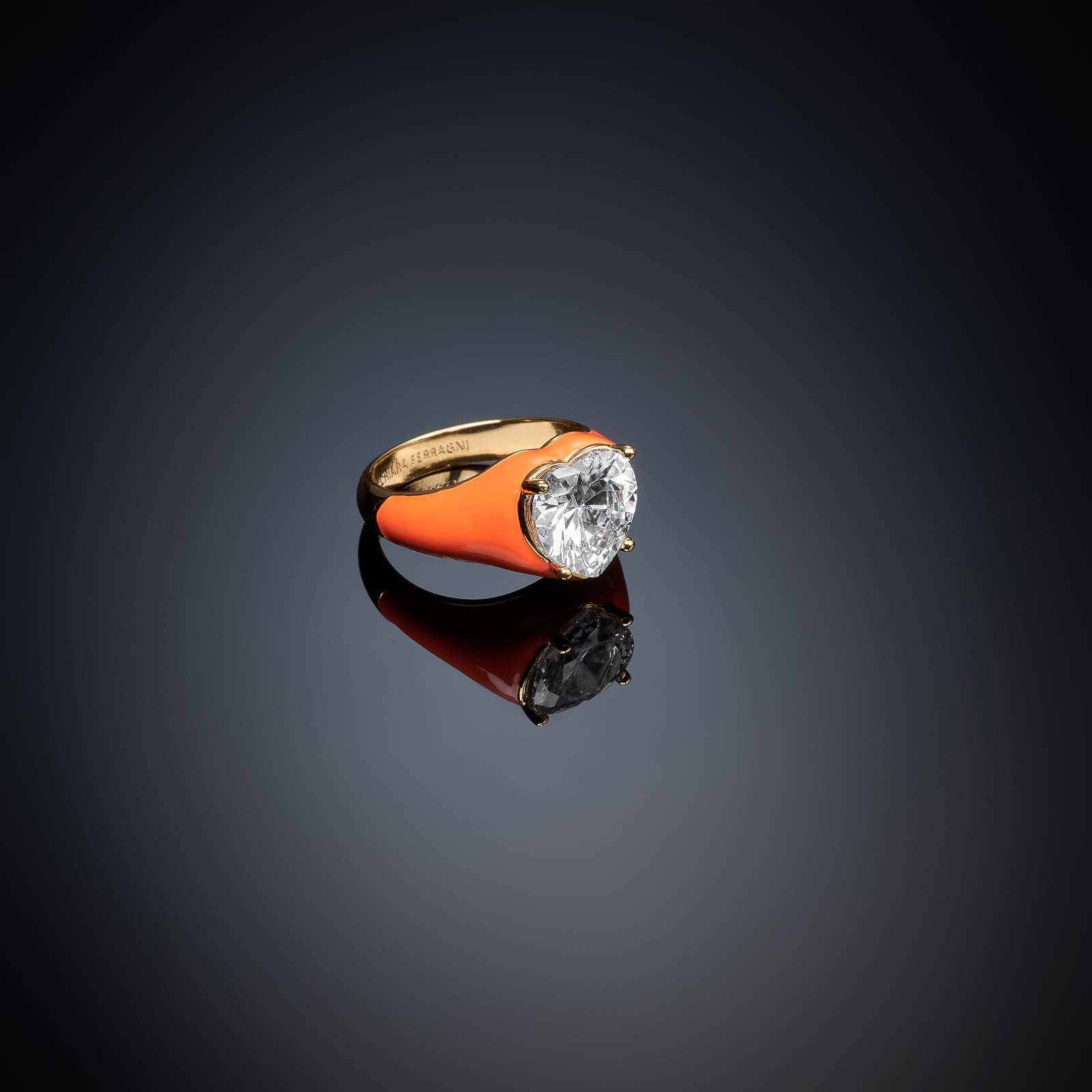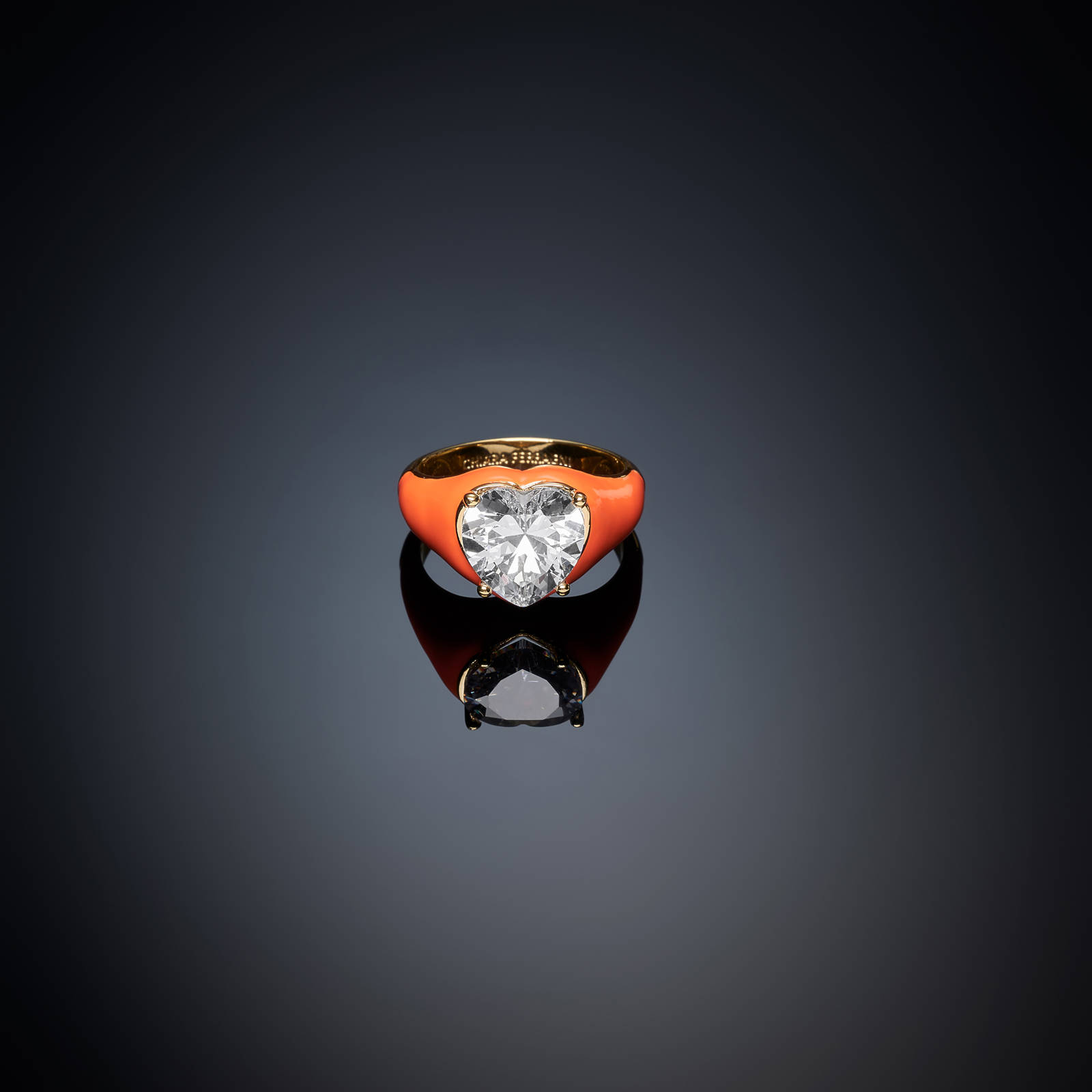 Γυναικείο δαχτυλίδι CHIARA FERRAGNI πορτοκαλί και χρυσού χρώματος με καρδιά. Είναι κατασκευασμένο από κράμα μετάλλων και είναι διακοσμημένο με διάφανη πέτρα σε σχήμα καρδιάς.