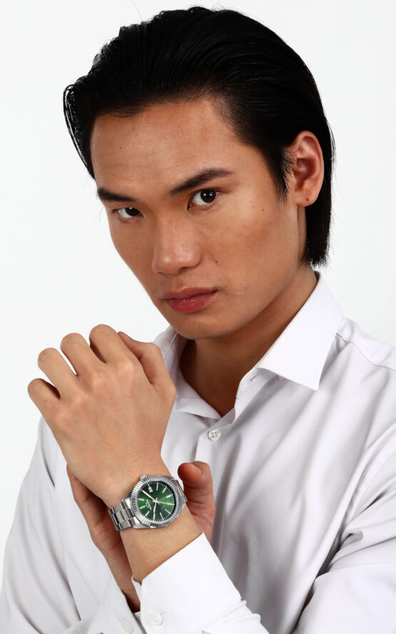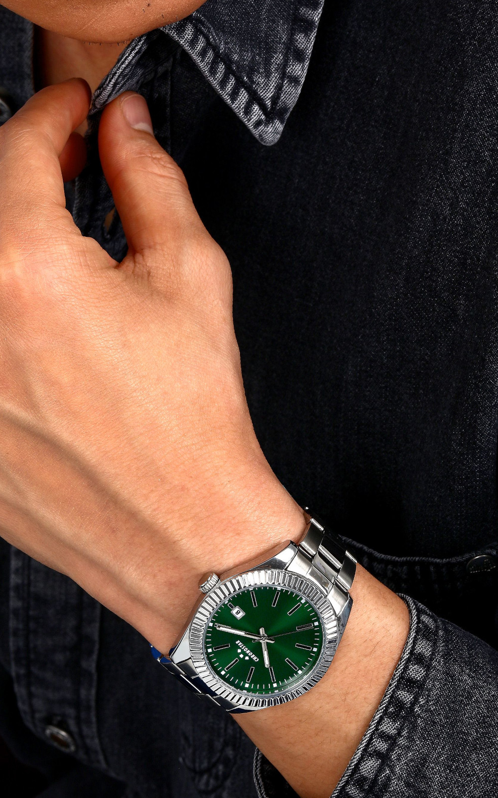 Ανδρικό ρολόι διαμέτρου 41mm με μηχανισμό QUARTZ ακριβείας. Έχει πράσινο καντράν με ασημένιους δείκτες και λεπτομέρειες. Η κάσα του είναι μεταλλική και έχει κρύσταλλο από ορυκτό κρύσταλλο ειδικής σκλήρυνσης. Έχει μπρασελέ μεταλλικό και κούμπωμα ασφαλείας. Δεν είναι αδιάβροχο.