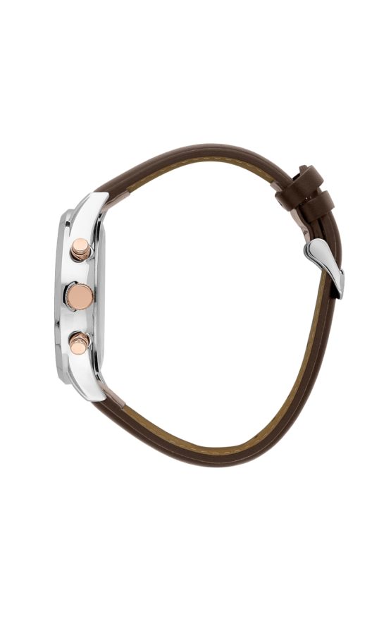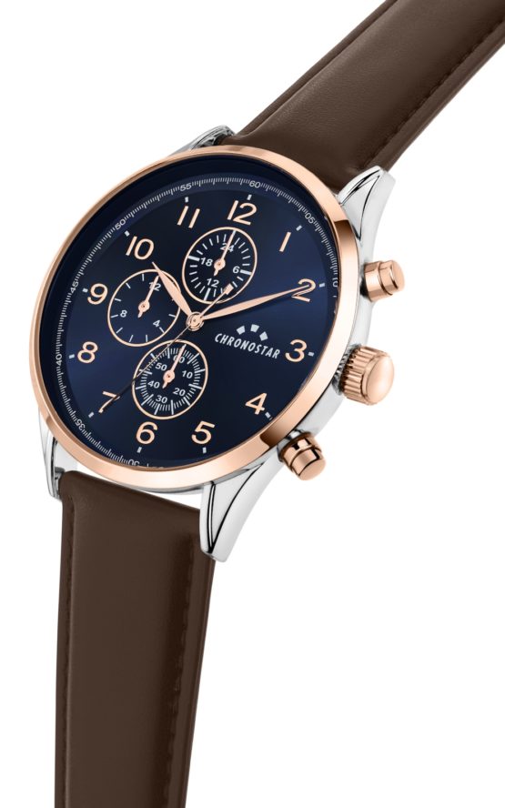 Ανδρικό ρολόι DANDY R3751300004 διαμέτρου 44mm, με μηχανισμό QUARTZ MULTI-FUCTION ακριβείας, μπλε καντράν, ροζ χρυσή μεταλλική κάσα και καφέ δερμάτινο λουράκι.