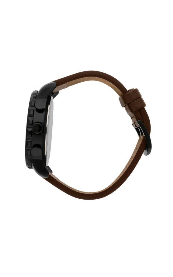 Ανδρικό ρολόι διαμέτρου 49mm με μηχανισμό QUARTZ Multi-Function ακριβείας. Έχει καφέ καντράν με επίχρυσους δείκτες και λεπτομέρειες. Η κάσα του είναι μεταλλική μαύρου χρώματος, με κρύσταλλο από ορυκτό κρύσταλλο ειδικής σκλήρυνσης. Έχει καφέ δερμάτινο λουράκι και κούμπωμα τοκάς. Είναι αδιάβροχο (3 ΑΤΜ).