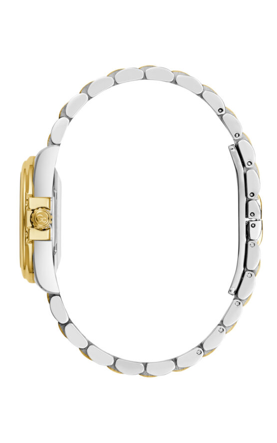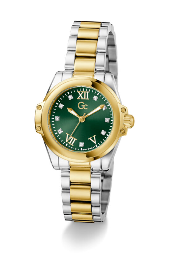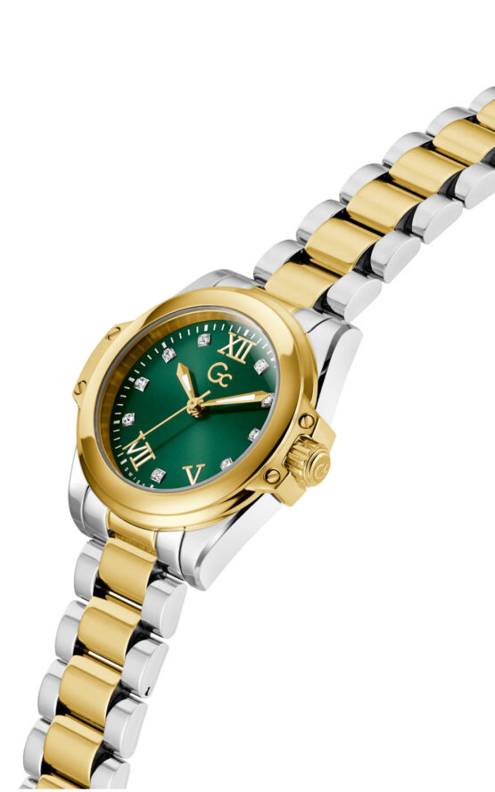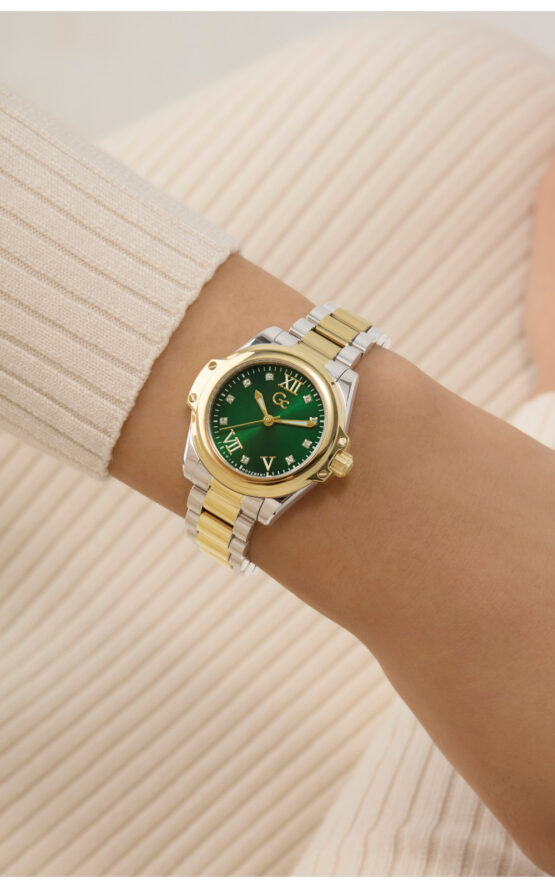 Γυναικείο ρολόι διαμέτρου 30mm, με μηχανισμό Quartz ακριβείας. Έχει πράσινο καντράν με χρυσούς δείκτες και λεπτομέρειες. Η κάσα του είναι ασημένια από ανοξείδωτο ατσάλι με χρυσές λεπτομέρειες και κρύσταλλο από ορυκτό κρύσταλλο. Έχει ασημένιο και χρυσό μπρασελέ από ανοξείδωτο ατσάλι και κούμπωμα ασφαλείας. Είναι αδιάβροχο (10 ΑΤΜ).