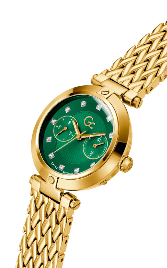 Γυναικείο ρολόι GC VOGUE Z21007L1MF διαμέτρου 36mm, με μηχανισμό Quartz Multi-Function ακριβείας, πράσινο καντράν, επίχρυση κάσα και μπρασελέ από ανοξείδωτο ατσάλι.