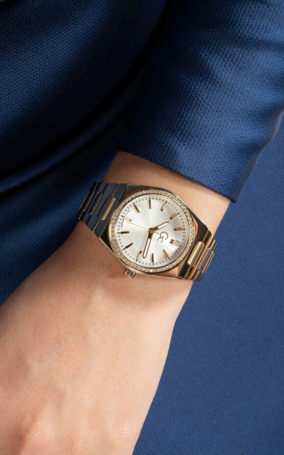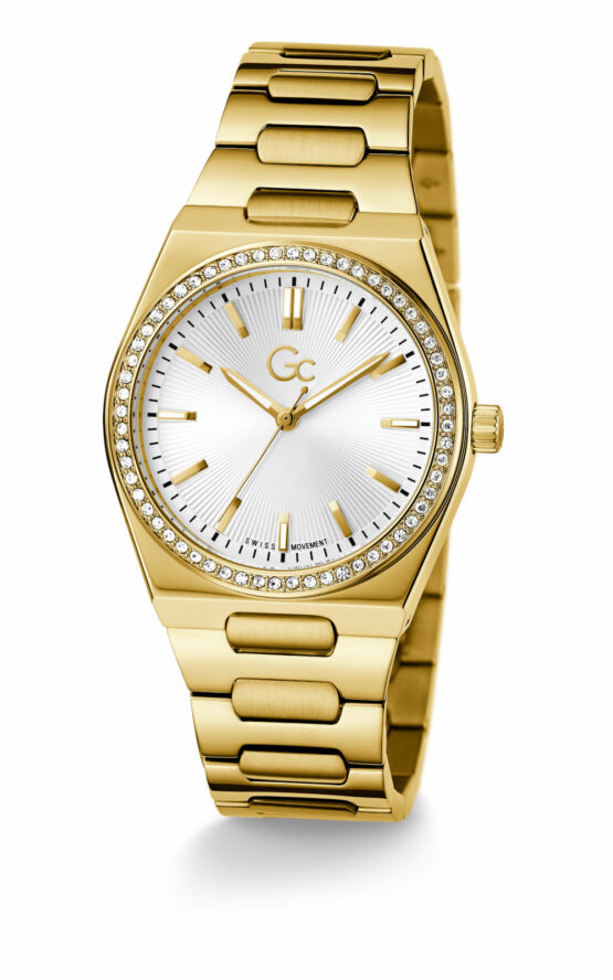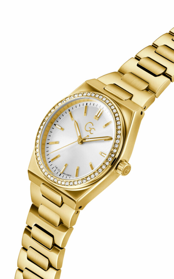 Γυναικείο ρολόι GC PRODIGY LADY Z38002L1MF διαμέτρου 34mm, με μηχανισμό Quartz ακριβείας, λευκό καντράν και επίχρυση κάσα και μπρασελέ από ανοξείδωτο ατσάλι.