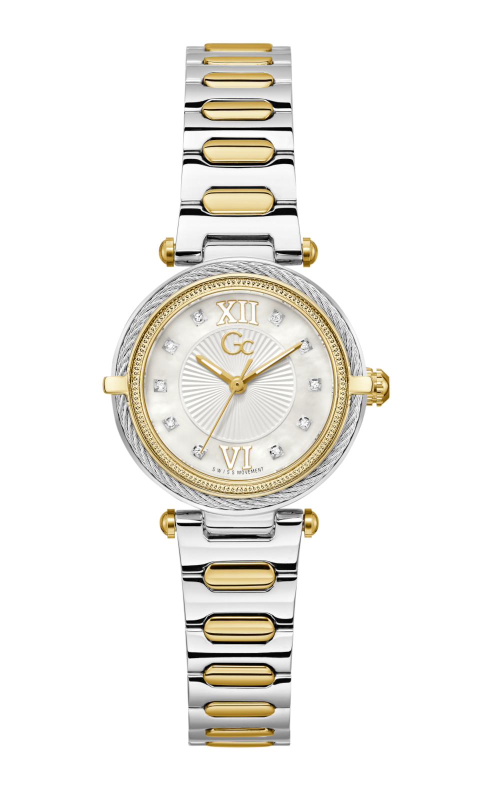 Γυναικείο ρολόι διαμέτρου 30mm, με μηχανισμό Quartz ακριβείας. Έχει λευκό καντράν με χρυσούς δείκτες και λεπτομέρειες. Η κάσα του είναι ασημένια από ανοξείδωτο ατσάλι με χρυσές λεπτομέρειες και κρύσταλλο από ορυκτό κρύσταλλο. Έχει ασημένιο και χρυσό μπρασελέ από ανοξείδωτο ατσάλι και κούμπωμα ασφαλείας. Είναι αδιάβροχο (10 ΑΤΜ).