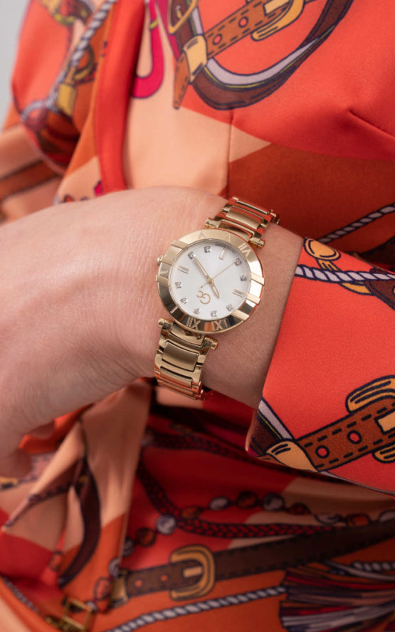 Γυναικείο ρολόι διαμέτρου 32mm, με μηχανισμό Quartz ακριβείας. Έχει ασημένιο καντράν διακοσμημένο με κρύσταλλα και επίχρυσους δείκτες και λεπτομέρειες. Η κάσα του είναι επίχρυση από ανοξείδωτο ατσάλι με κρύσταλλο ειδικής σκλήρυνσης με επικάλυψη ζαφείρι. Έχει επίχρυσο μπρασελέ από ανοξείδωτο ατσάλι και κούμπωμα ασφαλείας. Είναι αδιάβροχο (5 ΑΤΜ).