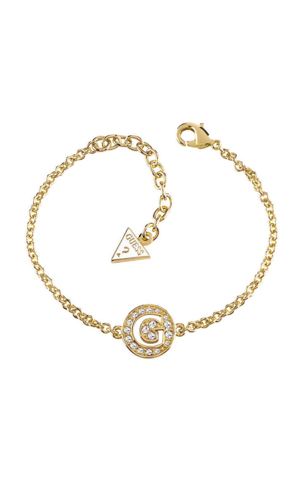 Γυναικείο βραχιόλι GUESS FAUX χρυσού χρώματος. Είναι διακοσμημένο με διαφανείς πέτρες ζιργκόν και έχει σχέδιο το λογότυπο της εταιρείας.