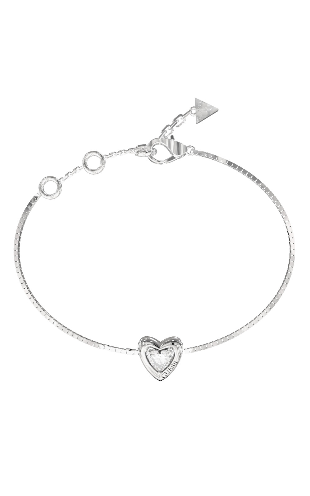 Γυναικείο βραχιόλι GUESS STEEL ασημένιου χρώματος. Έχει σχέδιο με καρδιά με πέτρα και λογότυπο(21cm).