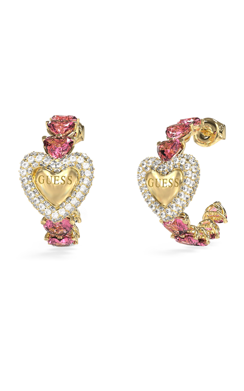 Γυναικεία σκουλαρίκια GUESS STEEL BELOVED JUBE06004JWYGPKT/U, χρυσά με καρδιές, ροζ και λευκές πέτρες(2,4cm).
