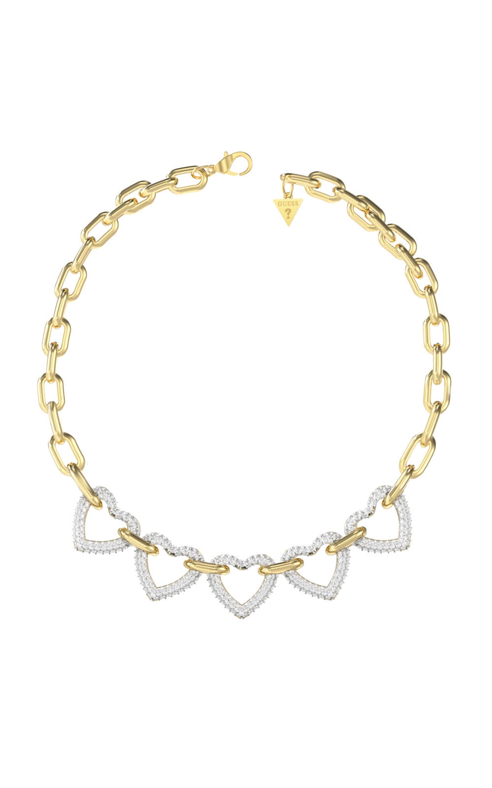 Γυναικείο κολιέ GUESS STEEL χρυσό, με καρδιές με πέτρες και λογότυπο(40,64-45,72cm).