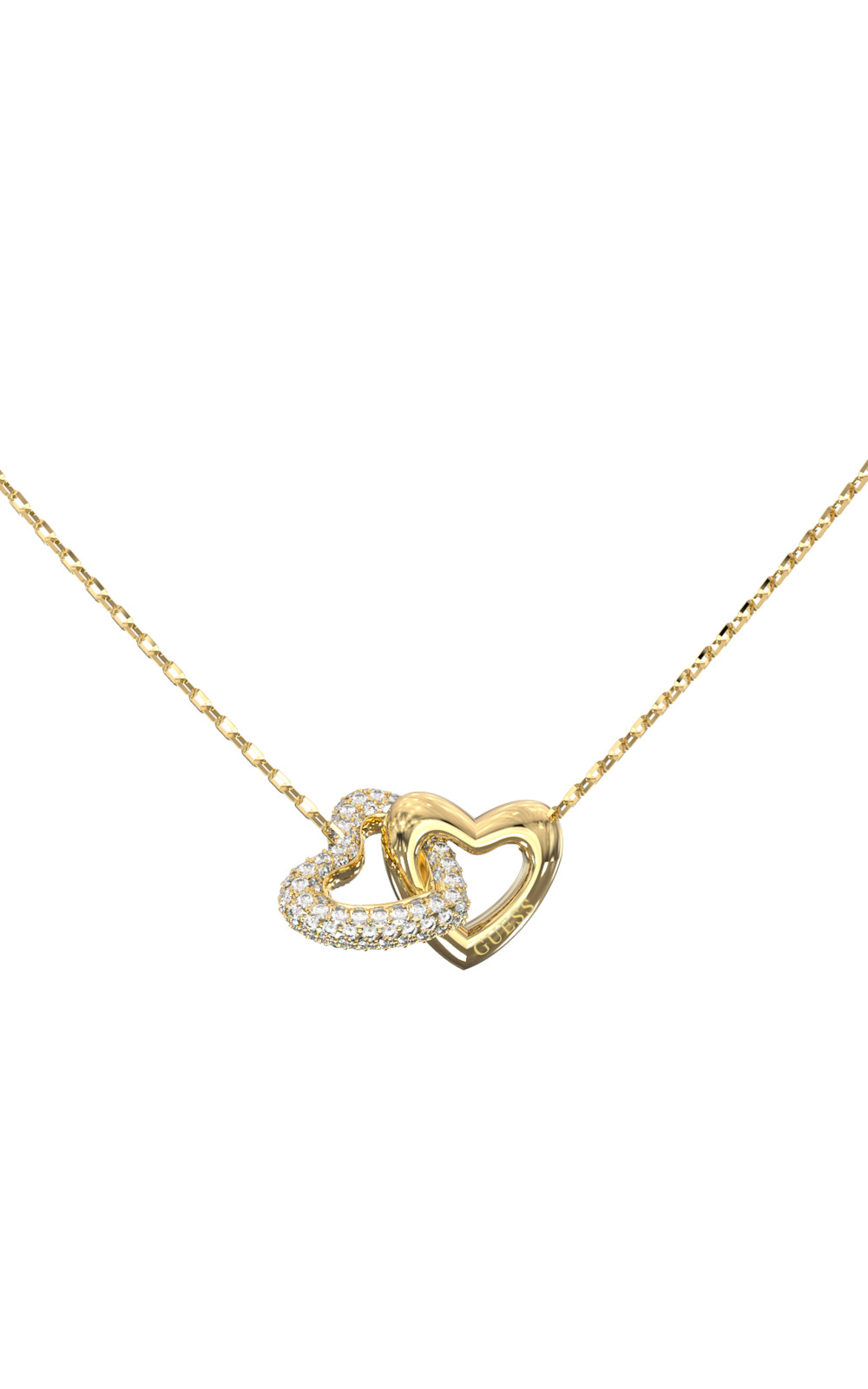 Γυναικείο κολιέ GUESS STEEL χρυσό, με δύο καρδιές με πέτρες και λογότυπο(40,64-45,72cm).