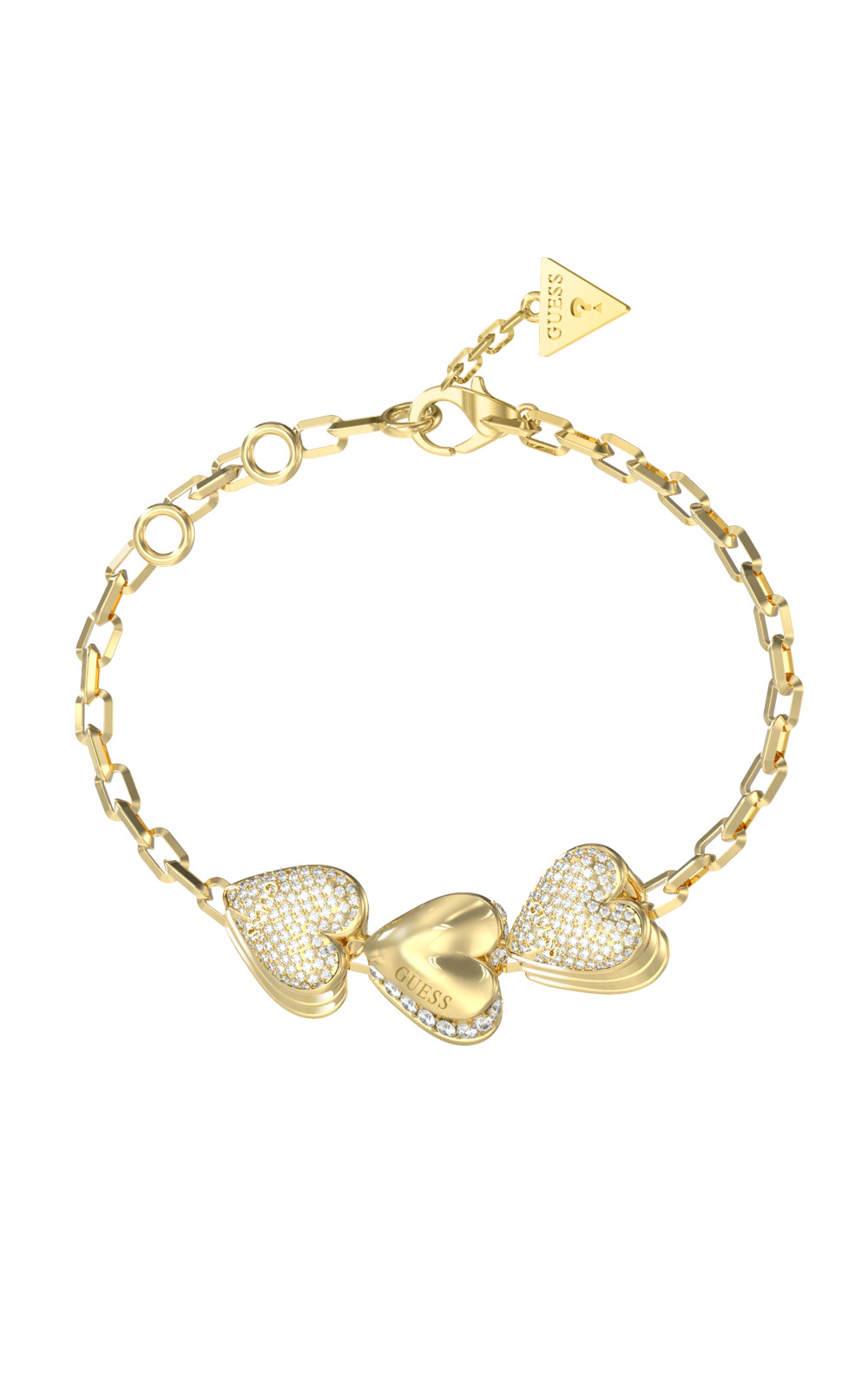 Γυναικείο βραχιόλι GUESS STEEL BY YOUR SIDE JUBB06079JWYGL χρυσού χρώματος με τρεις καρδιές, πέτρες και λογότυπο(21cm).