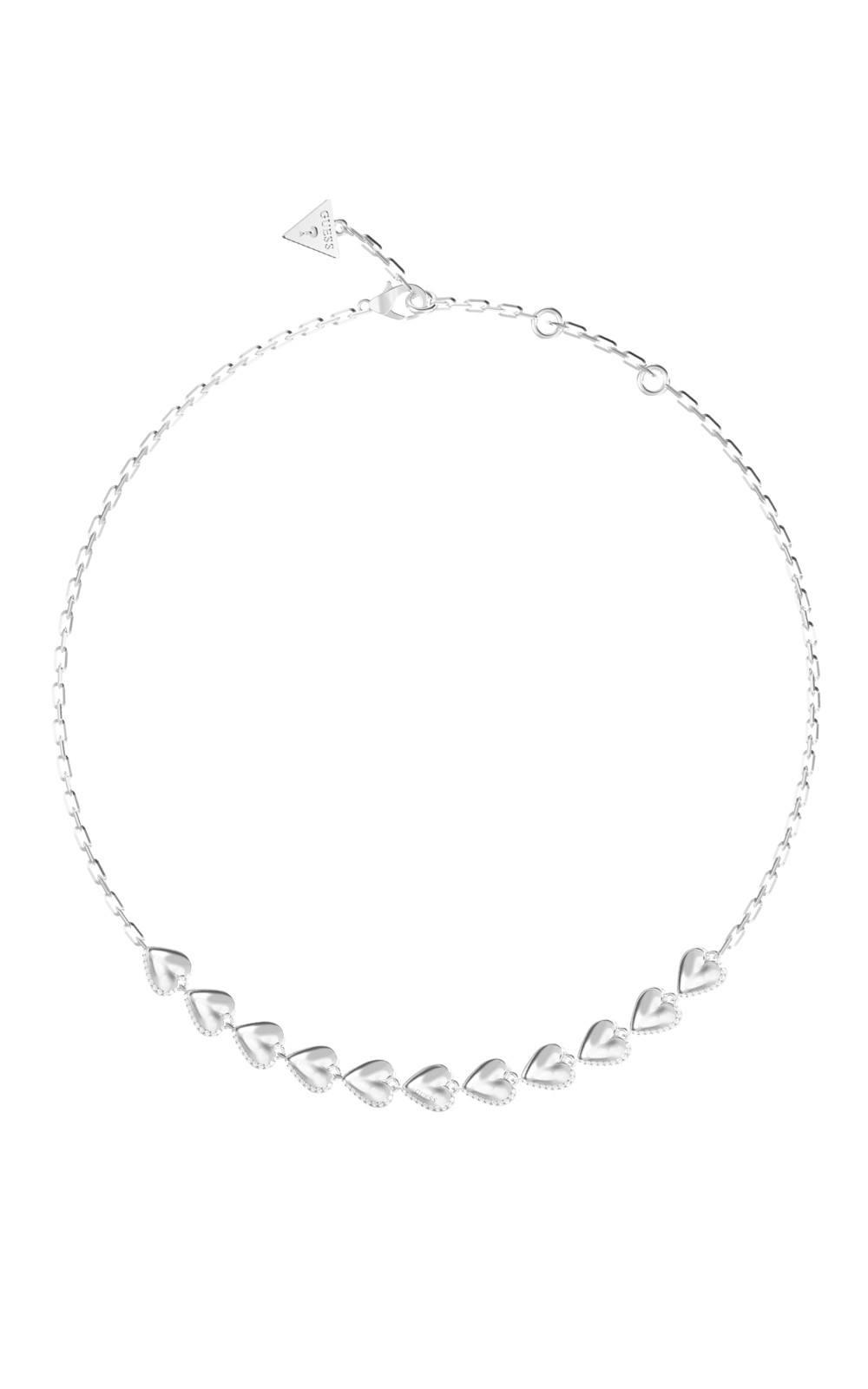 Γυναικείο κολιέ GUESS STEEL ασημένιο, με σχέδιο καρδιές και λογότυπο(40,64-45,72cm).