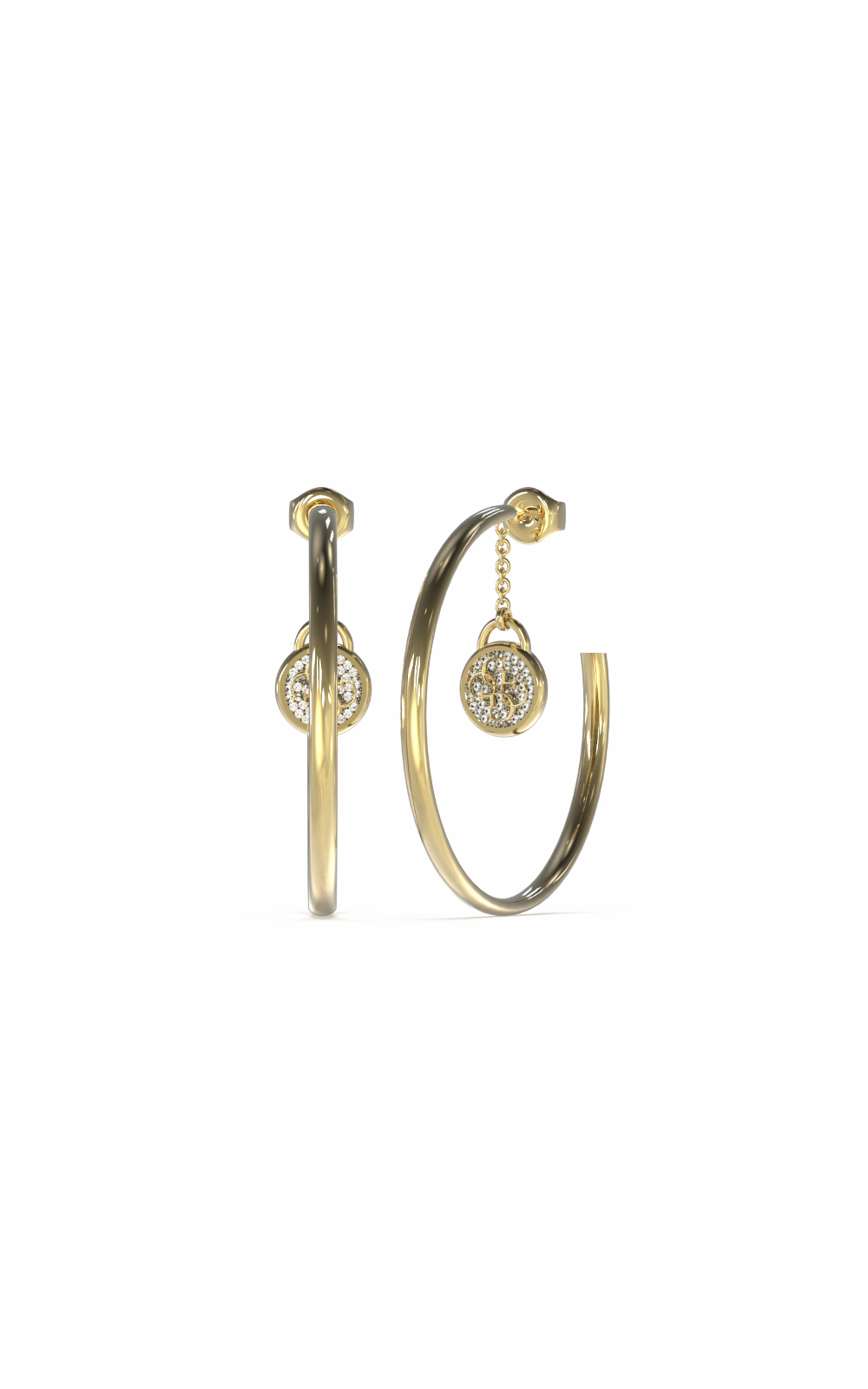 Γυναικεία σκουλαρίκια GUESS STEEL χρυσού χρώματος κρίκοι, με κρεμαστό σχέδιο, διακοσμημένοι με διαφανείς πέτρες ζιργκόν(5cm).