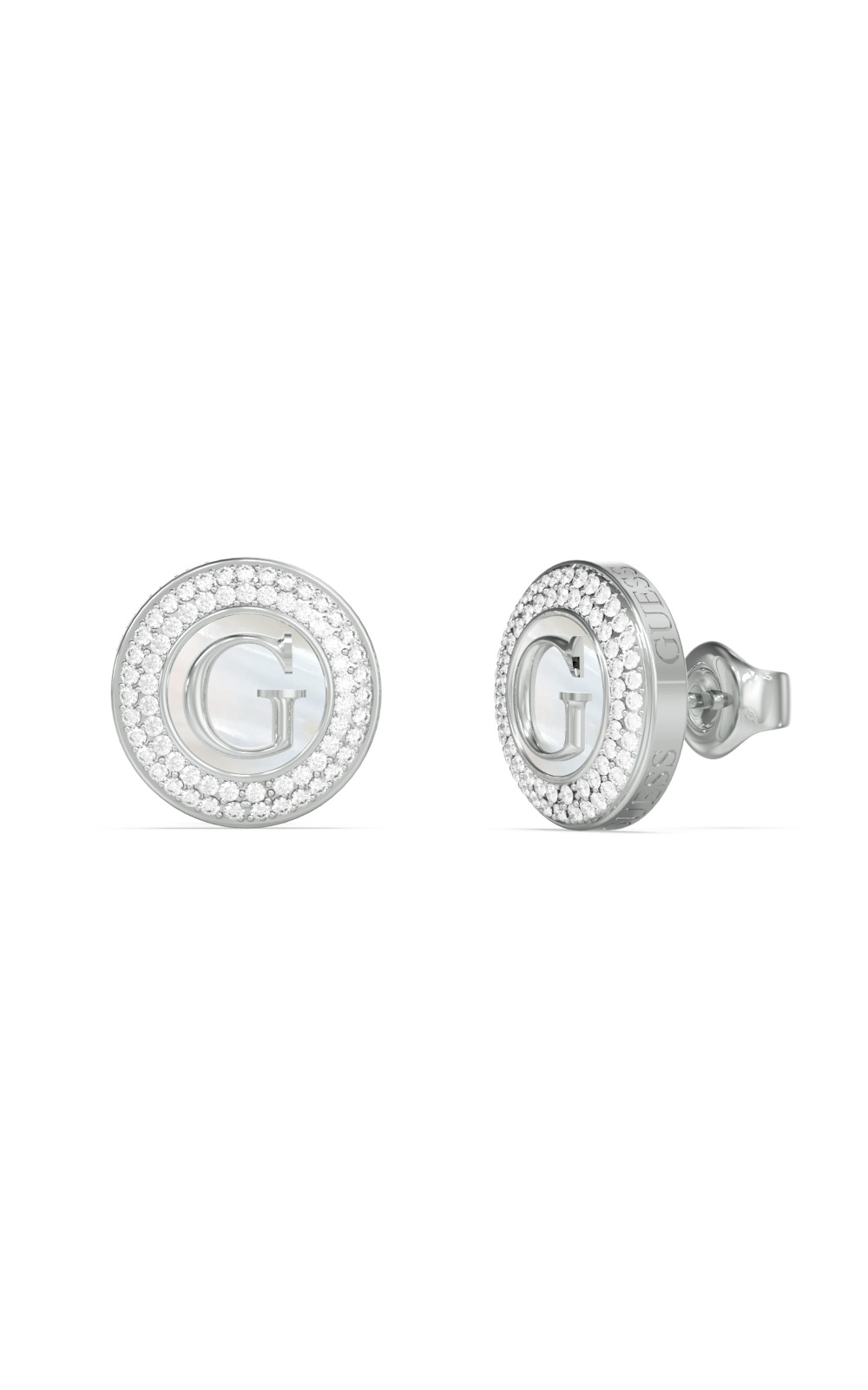 Γυναικεία σκουλαρίκια GUESS STEEL, ασημένια με πέτρες και λογότυπο(1,4cm).