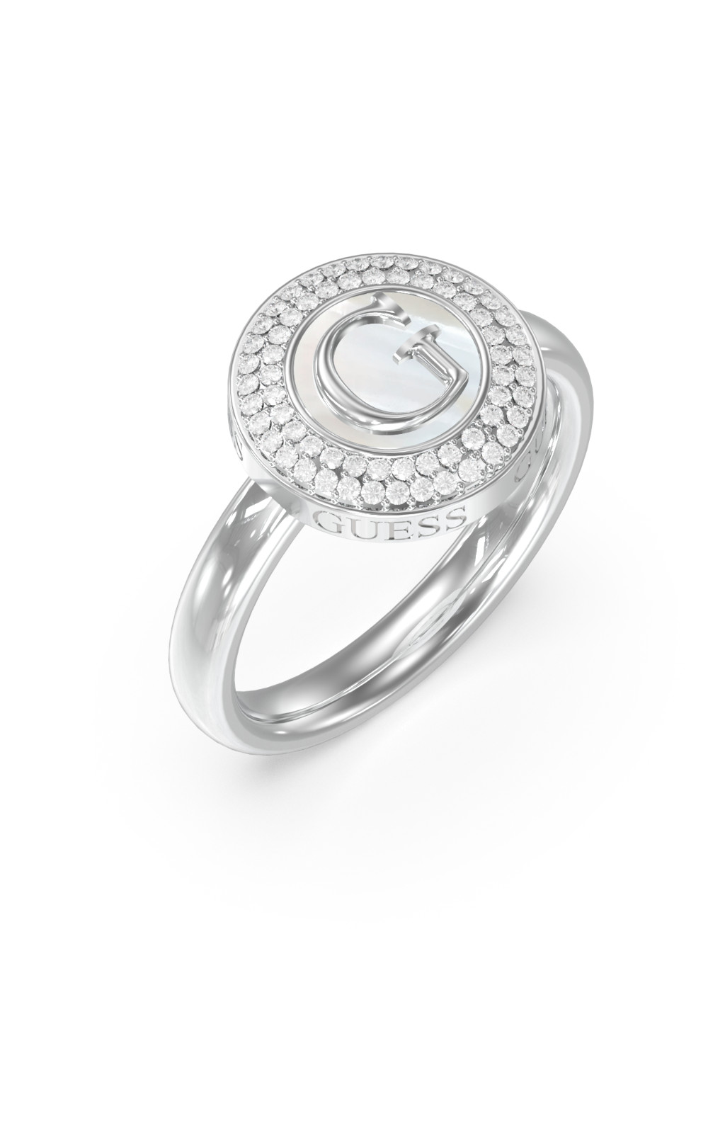 Γυναικείο δαχτυλίδι GUESS STEEL G TALISMAN JUBR06212JWRH-No.52 ασημένιο με λογότυπο με πέτρες.