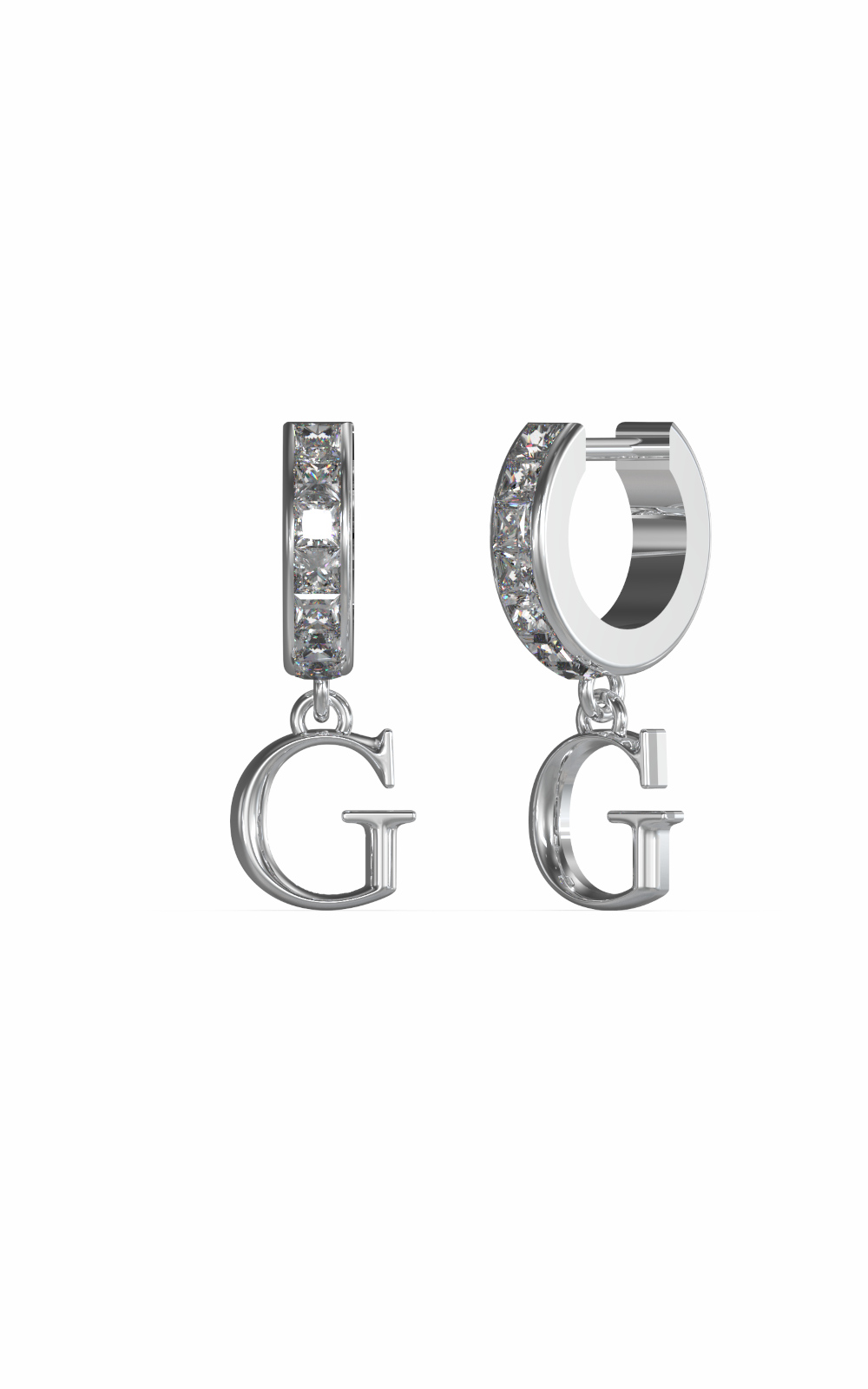 Γυναικεία σκουλαρίκια μικροί κρίκοι GUESS STEEL ασημένιου χρώματος, με κρεμαστό λογότυπο GUESS και ζιργκόν(2cm).
