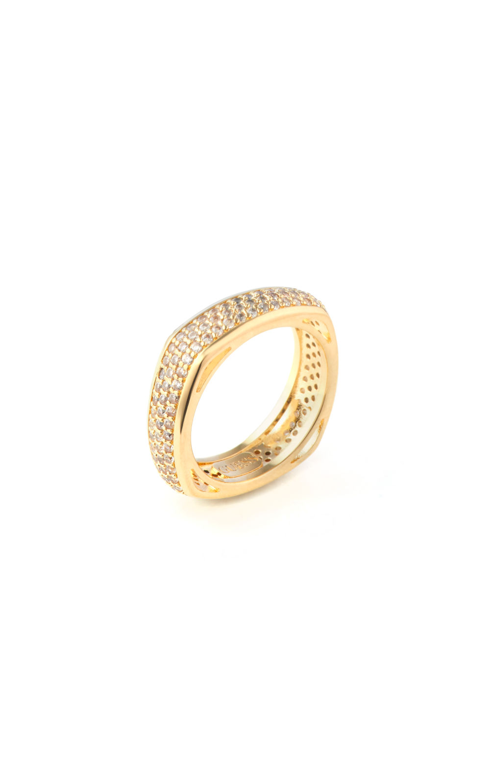 Γυναικείο δαχτυλίδι GUESS STEEL χρυσού χρώματος. Είναι διακοσμημένο με διαφανείς πέτρες ζιργκόν και λογότυπο της εταιρείας.