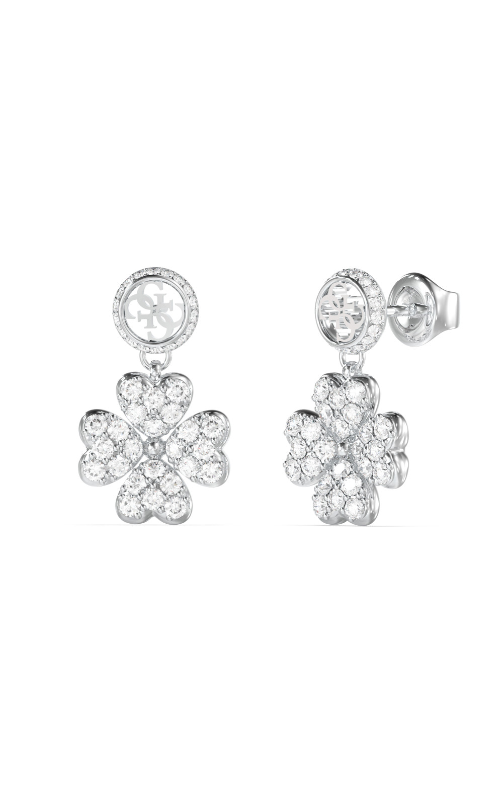 Γυναικεία σκουλαρίκια GUESS STEEL, ασημένια με σχέδιο κρεμαστό τετράφυλλο με πέτρεςκαι λογότυπο(2,2cm).