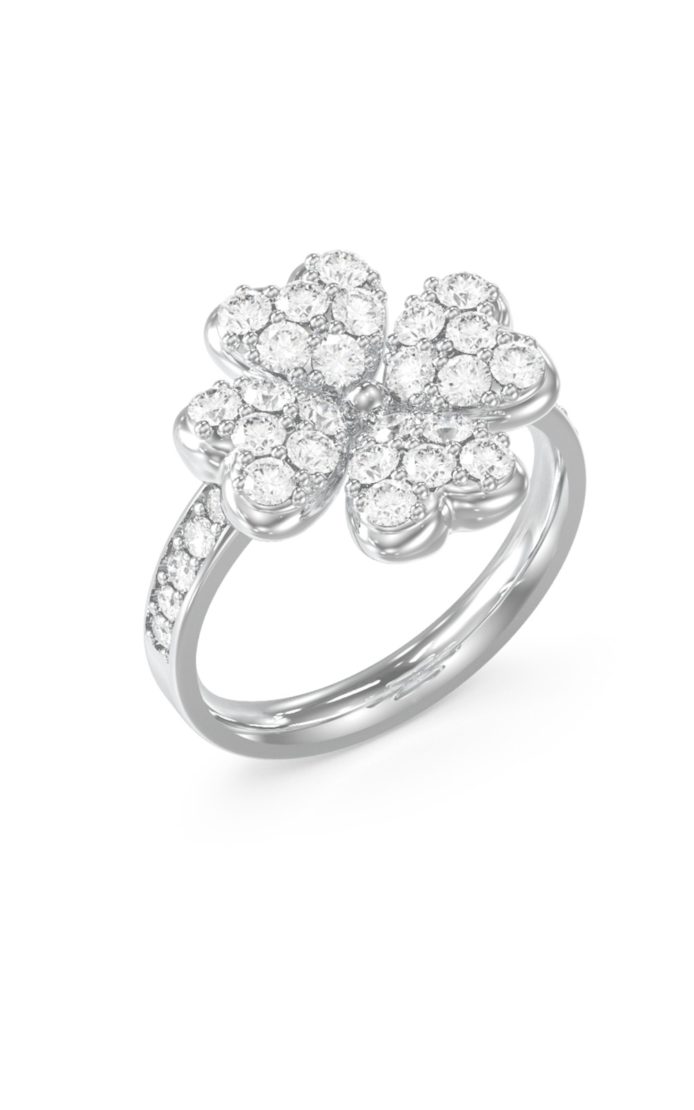 Γυναικείο δαχτυλίδι GUESS STEEL LOVE BITES JUBR06046JWRH-No.56 ασημένιου χρώματος με τυχερό τετράφυλλο, με πέτρες και λογότυπο