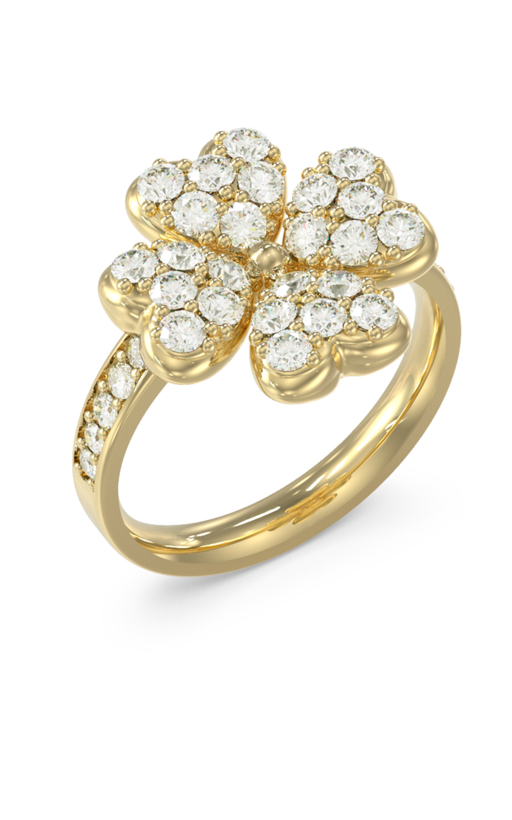 Γυναικείο δαχτυλίδι GUESS STEEL χρυσού χρώματος με τυχερό τετράφυλλο, με πέτρες και λογότυπο.