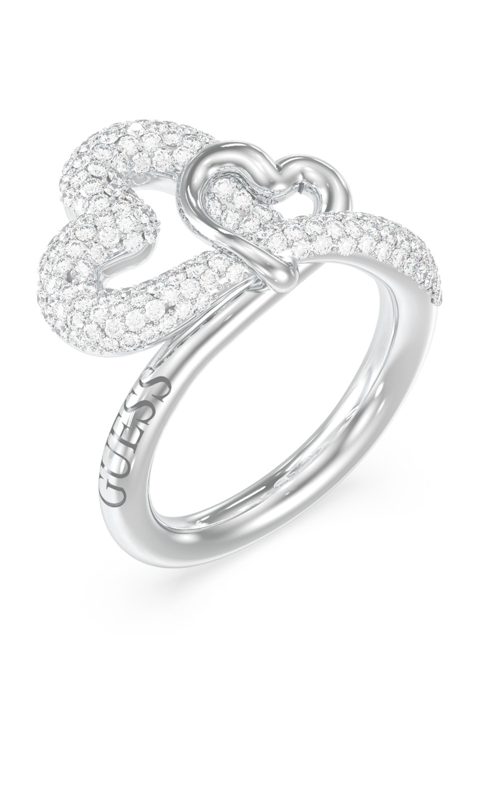 Γυναικείο δαχτυλίδι GUESS STEEL LOVE BITES JUBR06055JWRH-No.54 ασημένιου χρώματος με σχέδιο καρδιές, με πέτρες και λογότυπο