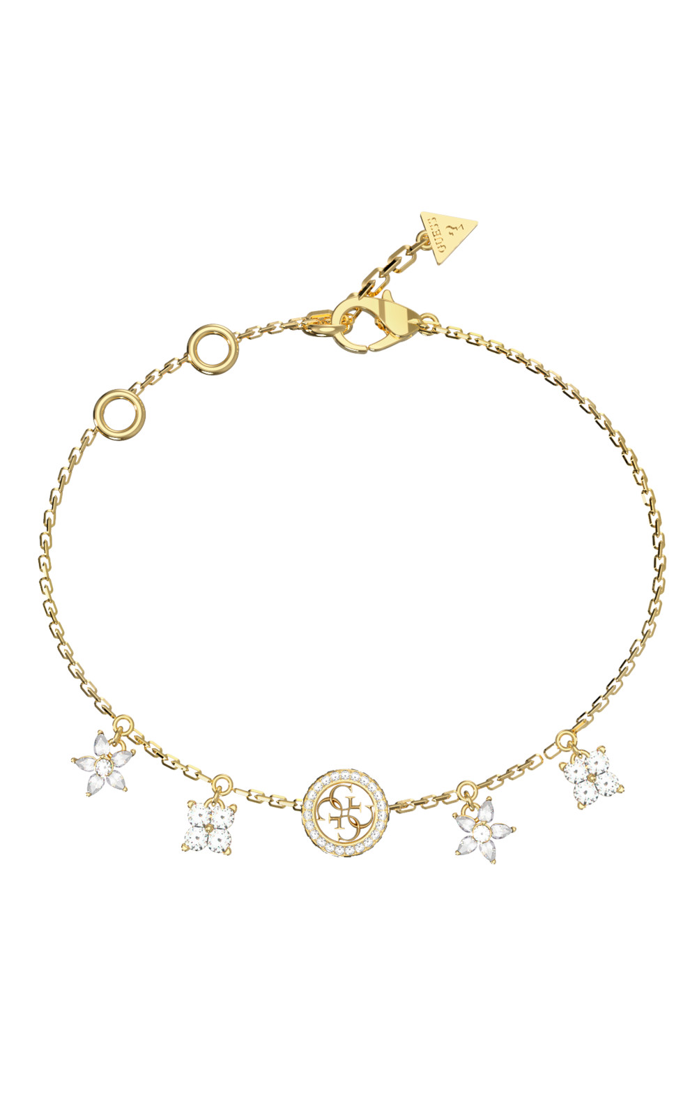 Γυναικείο βραχιόλι GUESS STEEL SECRET GARDEN JUBB06033JWYGL χρυσού χρώματος με κρεμαστά σχέδια και λογότυπο(21cm).