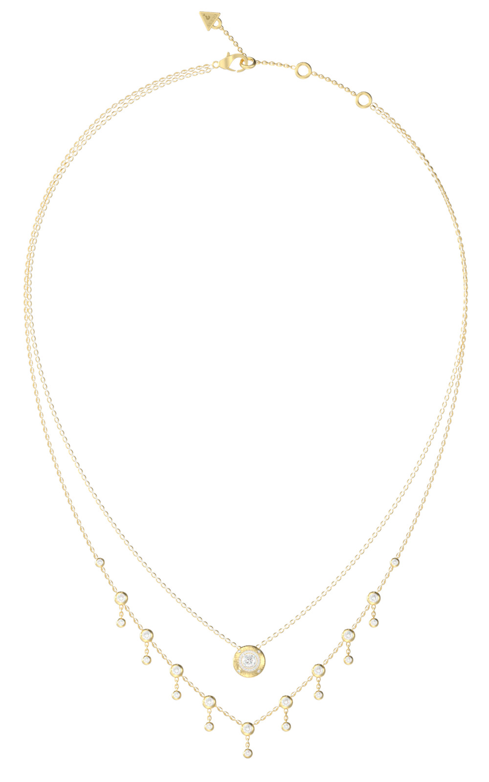 Γυναικείο κολιέ GUESS STEEL χρυσό, με διπλή αλυσίδα, με κρεμαστά τσαρμ και σχέδιο με πέτρες(40,64-45,72cm).