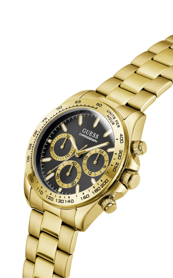 Ανδρικό ρολόι διαμέτρου 42mm με μηχανισμό QUARTZ χρονογράφος ακριβείας. Έχει μαύρο καντράν με χρυσούς δείκτες και λεπτομέρειες. Η κάσα του είναι χρυσή από ανακυκλωμένο ατσάλι και έχει κρύσταλλο από ορυκτό κρύσταλλο ειδικής σκλήρυνσης. Έχει μπρασελέ από ανακυκλωμένο ατσάλι με κούμπωμα ασφαλείας. Είναι αδιάβροχο (5 ΑΤΜ).