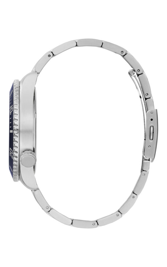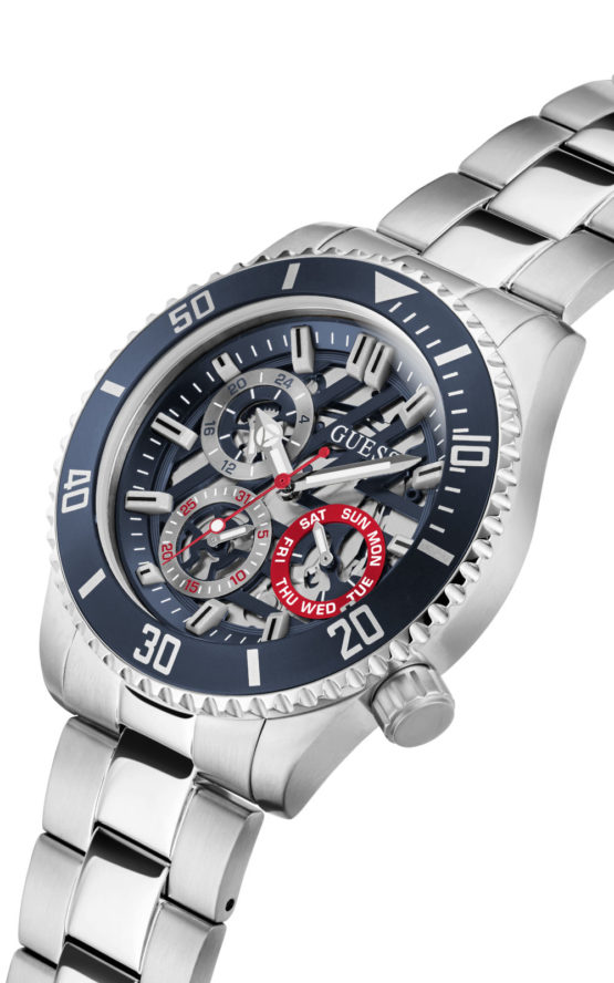 Ανδρικό ρολόι διαμέτρου 45mm με μηχανισμό QUARTZ Multi-Function ακριβείας. Έχει μπλε, ασημί και κόκκινο καντράν με εμφανή μηχανισμό και ασημένιους δείκτες με λευκές λεπτομέρειες. Η κάσα του είναι ασημί με μπλε από ανοξείδωτο ατσάλι, με κρύσταλλο από ορυκτό κρύσταλλο ειδικής σκλήρυνσης. Έχει ασημί μπρασελέ από ανοξείδωτο ατσάλι και κούμπωμα ασφαλείας. Είναι αδιάβροχο (5 ΑΤΜ).