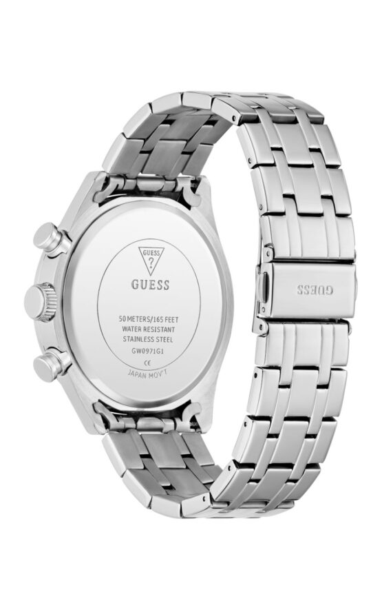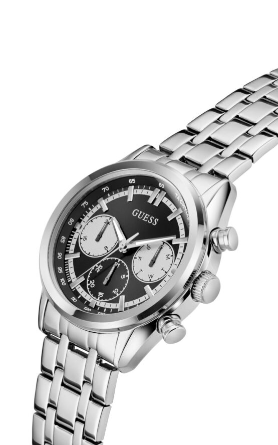 Ανδρικό ρολόι GUESS DAWSON GW0971G1 διαμέτρου 44mm, με μηχανισμό Quartz Multifuction ακριβείας, μαύρο καντράν, κάσα και μπρασελέ από ανακυκλωμένο ατσάλι.