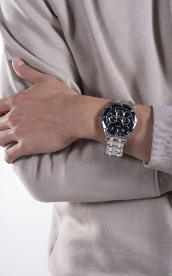 Ανδρικό ρολόι διαμέτρου 44mm με μηχανισμό QUARTZ Multi-Function ακριβείας. Έχει μαύρο καντράν με ασημένιους δείκτες και λεπτομέρειες. Η κάσα του είναι από ανοξείδωτο ατσάλι, με κρύσταλλο από ορυκτό κρύσταλλο ειδικής σκλήρυνσης. Έχει μπρασελέ από ανοξείδωτο ατσάλι και κούμπωμα ασφαλείας. Είναι αδιάβροχο (5 ΑΤΜ).