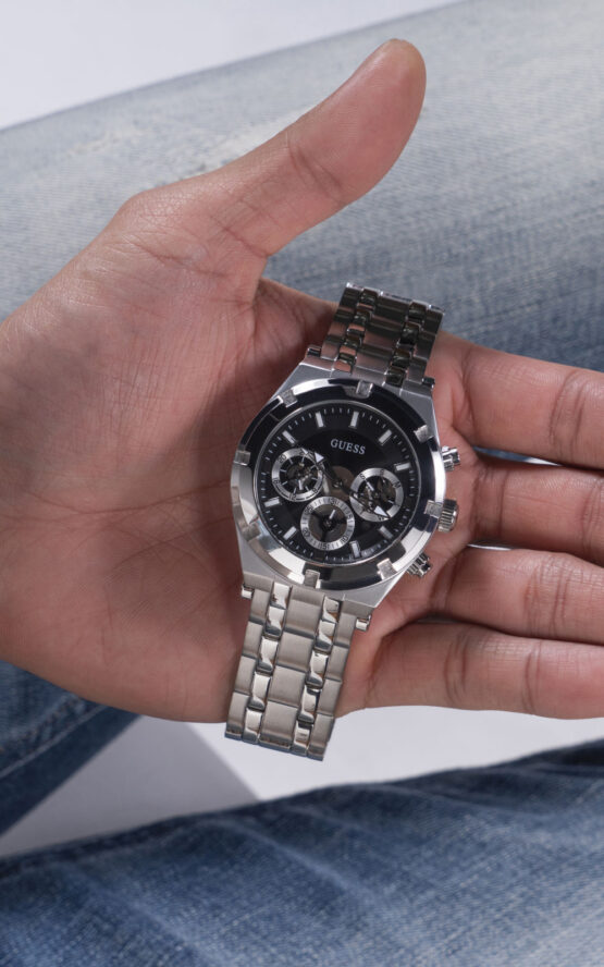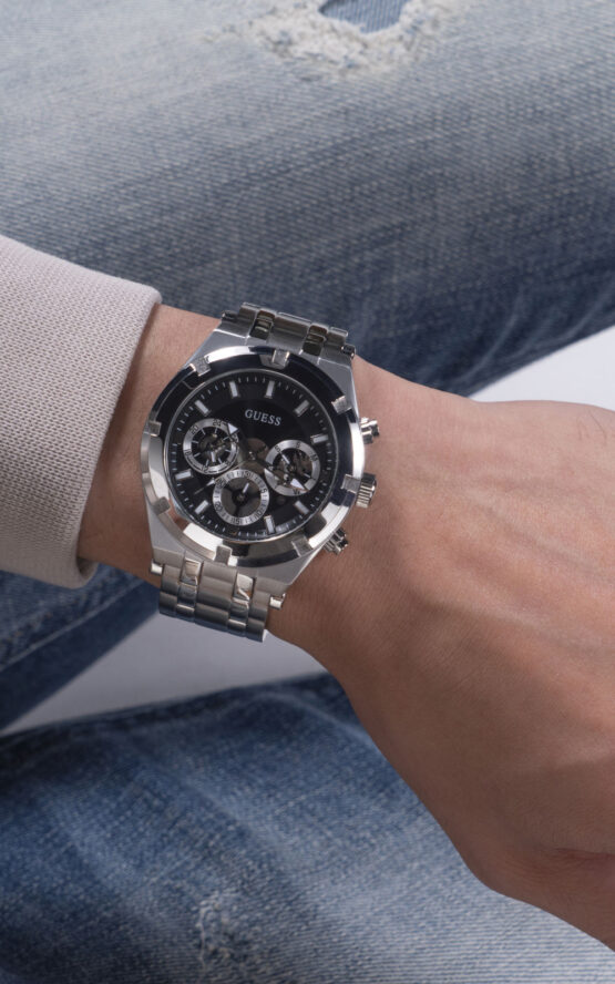Αντρικό ρολόι GUESS CONTINENTAL GW0260G1 διαμέτρου 44mm, με μηχανισμό QUARTZ Multi-Function ακριβείας, μαύρο καντράν, κάσα και μπρασελέ από ανοξείδωτο ατσάλι.