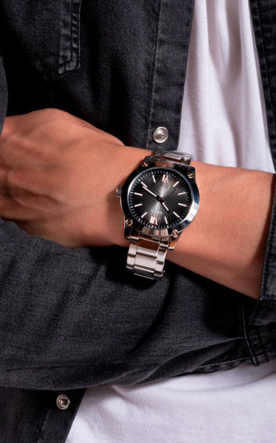 Ανδρικό ρολόι διαμέτρου 44mm με μηχανισμό QUARTZ ακριβείας. Έχει μαύρο καντράν και ροζ επίχρυσους δείκτες. Η κάσα του είναι από ανοξείδωτο ατσάλι, με κρύσταλλο από ορυκτό κρύσταλλο ειδικής σκλήρυνσης. Έχει μπρασελέ από ανοξείδωτο ατσάλι με κούμπωμα ασφαλείας. Είναι αδιάβροχο (5 ΑΤΜ).