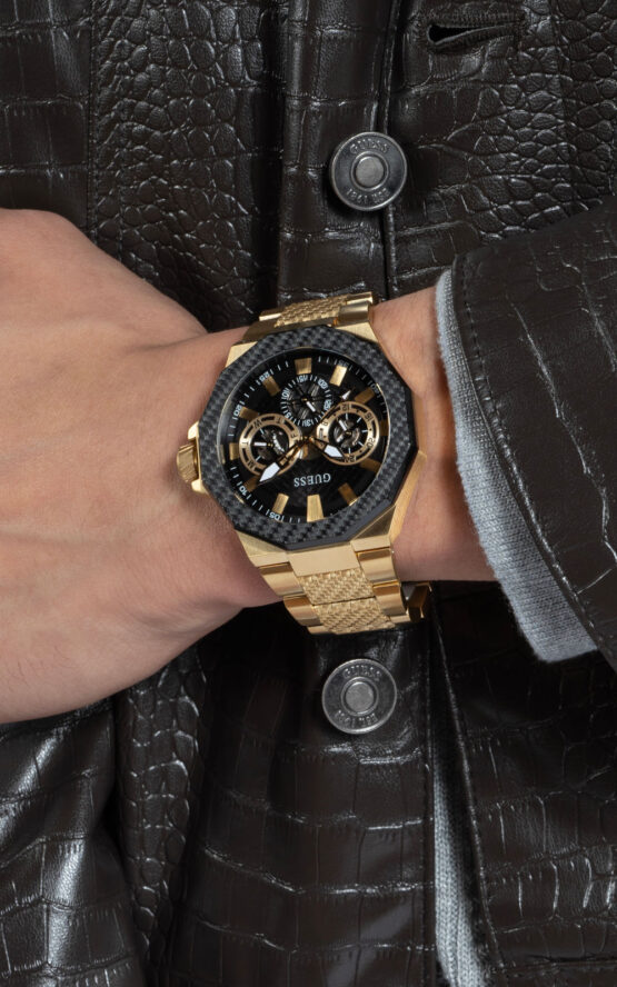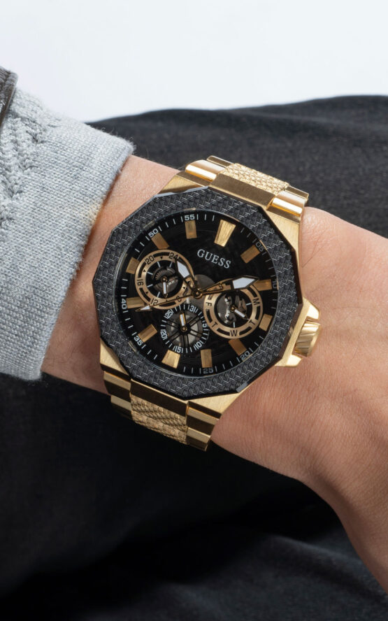 Ανδρικό ρολόι GUESS INDY GW0636G2 διαμέτρου 45mm, με μηχανισμό QUARTZ Multi-Function ακριβείας, μαύρο καντράν, επίχρυση κάσα και μπρασελέ από ανοξείδωτο ατσάλι.