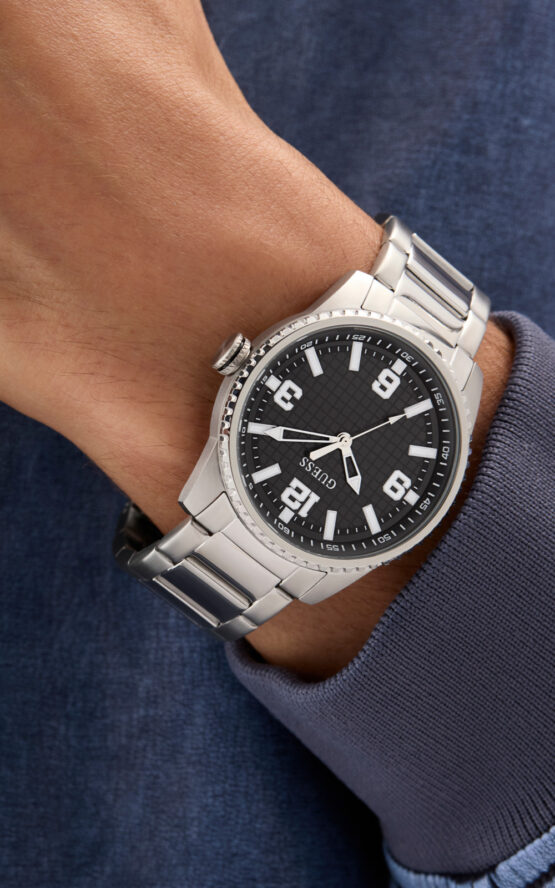 Ανδρικό ρολόι διαμέτρου 42mm με μηχανισμό QUARTZ ακριβείας. Έχει μαύρο καντράν με ασημί δείκτες και λεπτομέρειες. Η κάσα του είναι ασημένια από ανακυκλωμένο ατσάλι, με κρύσταλλο από ορυκτό κρύσταλλο ειδικής σκλήρυνσης. Έχει ασημένιο μπρασελέ από ανακυκλωμένο ατσάλι και κούμπωμα ασφαλείας. Είναι αδιάβροχο (5 ΑΤΜ).
