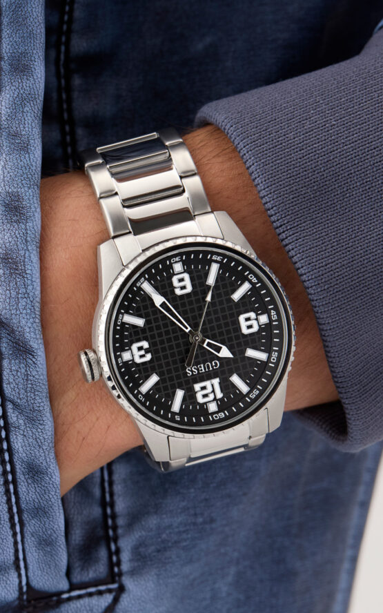 Ανδρικό ρολόι GUESS VARSITY G GW0889G1 διαμέτρου 42mm, με μηχανισμό Quartz ακριβείας, μαύρο καντράν, κάσα και μπρασελέ από ανακυκλωμένο ατσάλι.
