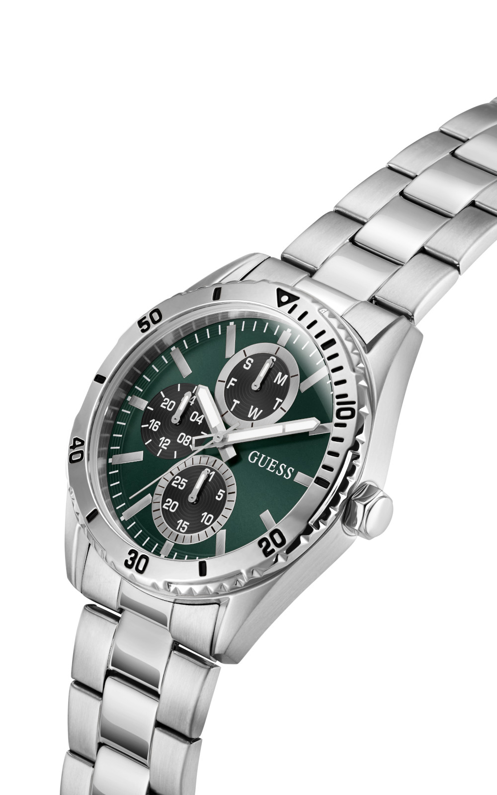Ανδρικό ρολόι GUESS VELOCITY GW1061G1 διαμέτρου 43mm, με μηχανισμό QUARTZ MULTIFUCTION ακριβείας, πράσινο καντράν,κάσα και μπρασελέ από ανακυκλωμένο ατσάλι και κούμπωμα ασφαλείας.