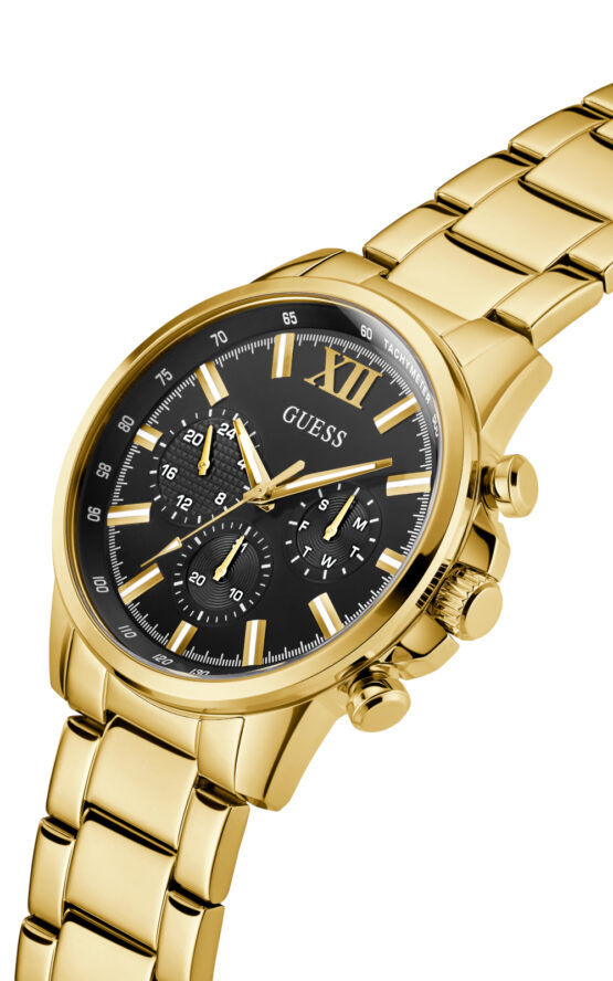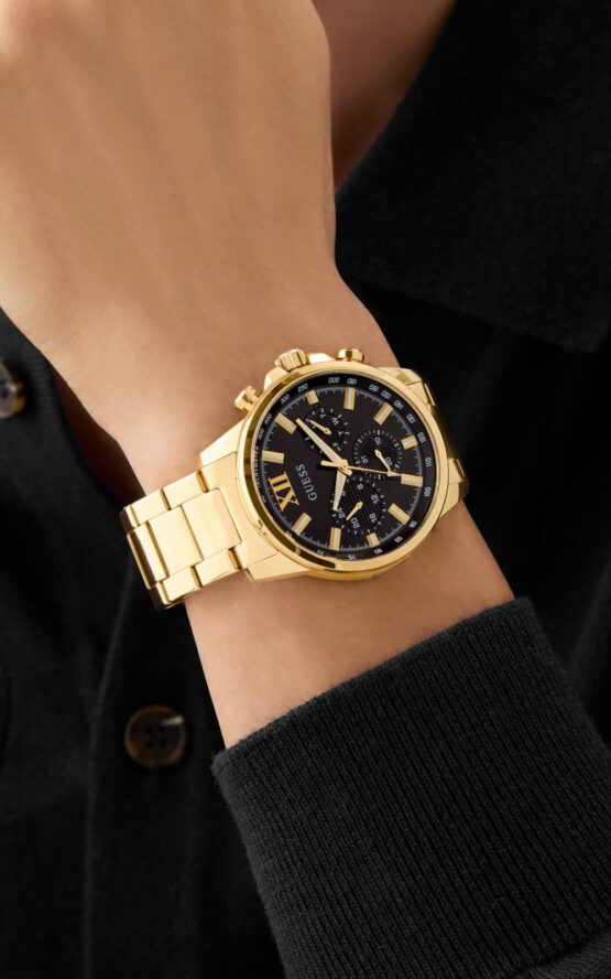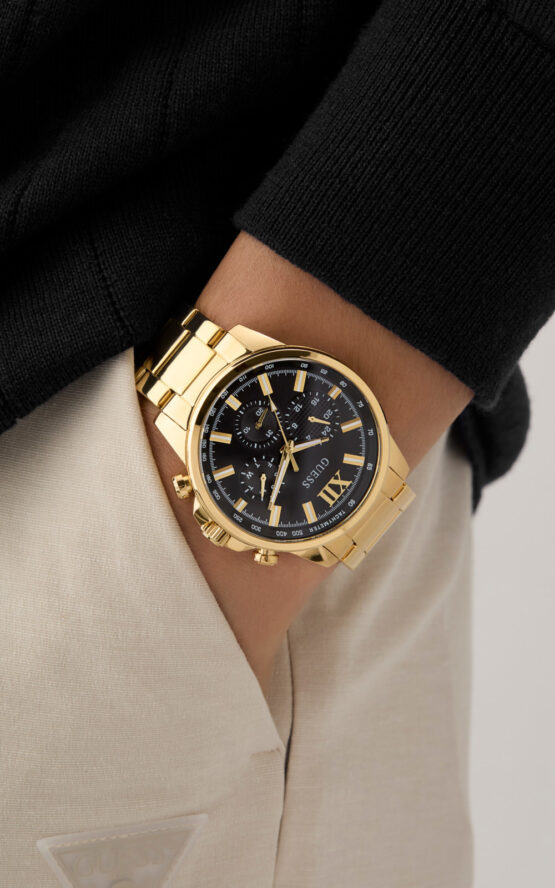 Ανδρικό ρολόι διαμέτρου 44mm με μηχανισμό QUARTZ Multi-Function ακριβείας. Έχει μαύρο καντράν με χρυσούς δείκτες και λεπτομέρειες. Η κάσα του είναι ασημένια από ανακυκλωμένο ατσάλι, με κρύσταλλο από ορυκτό κρύσταλλο ειδικής σκλήρυνσης. Έχει μπρασελέ από ανακυκλωμένο ατσάλι και κούμπωμα ασφαλείας. Είναι αδιάβροχο (5 ΑΤΜ).