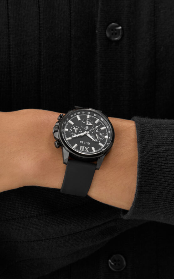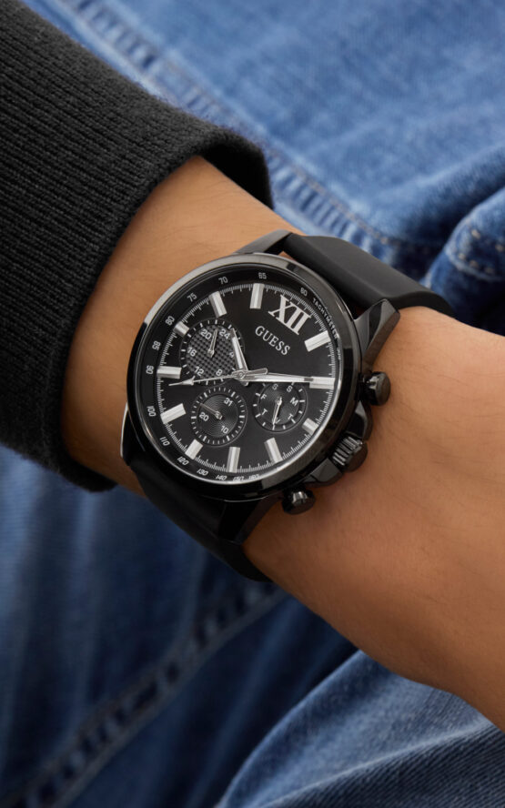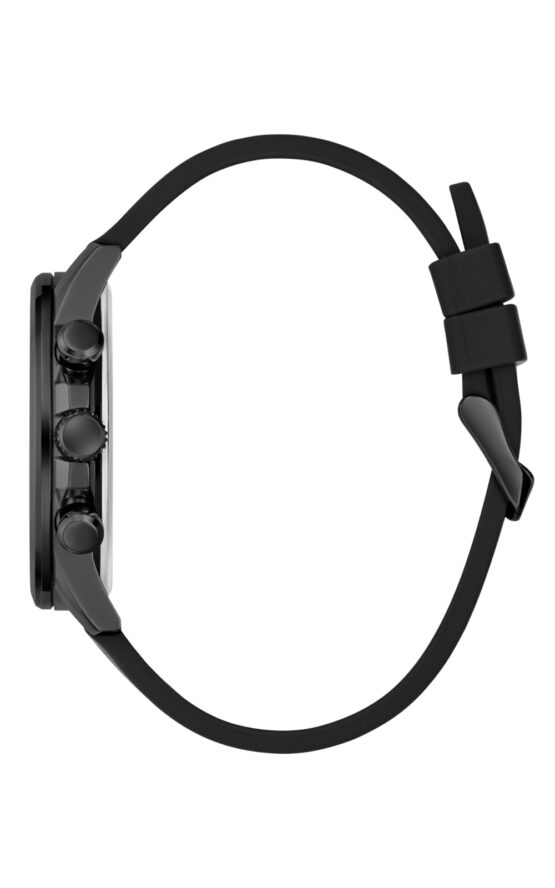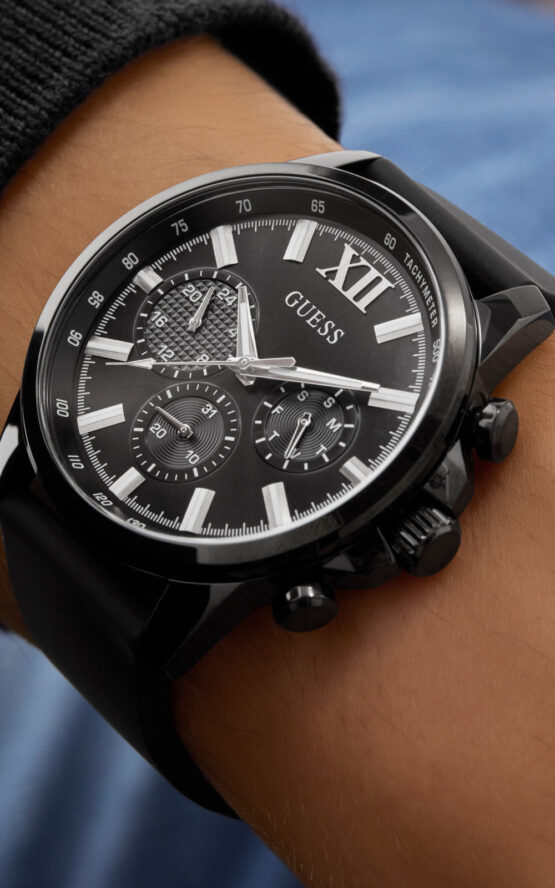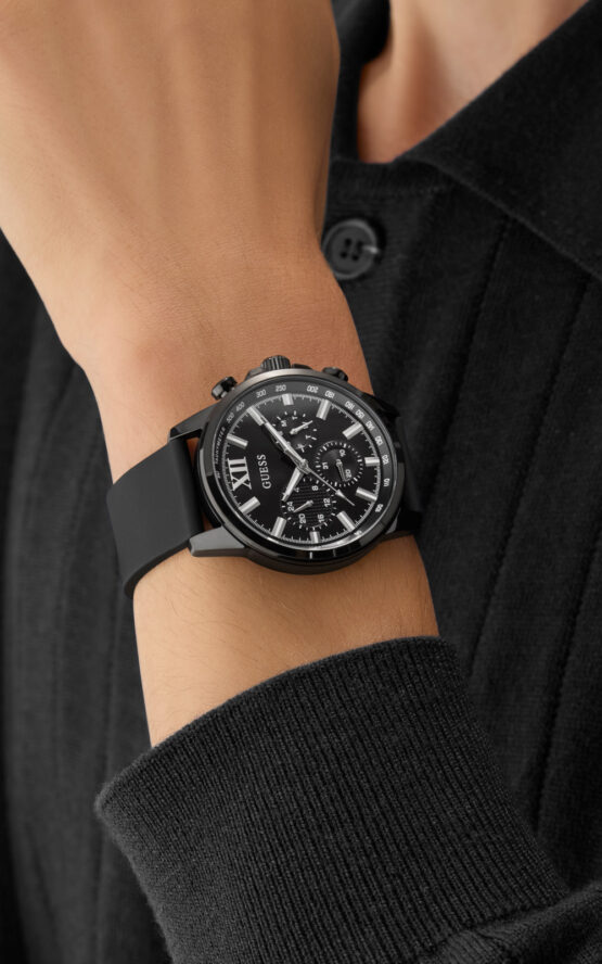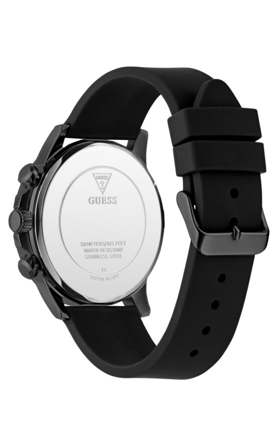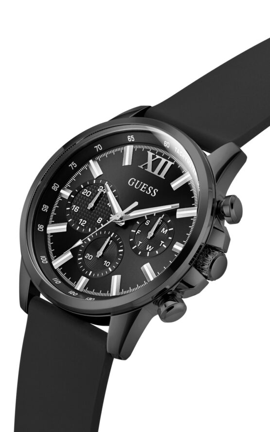 Αντρικό ρολόι GUESS WALKER GW0913G3 διαμέτρου 44mm, με μηχανισμό QUARTZ Multi-Function ακριβείας, μαύρο καντράν, κάσα από ανακυκλωμένο ατσάλι και μαύρο λουράκι από καουτσούκ.