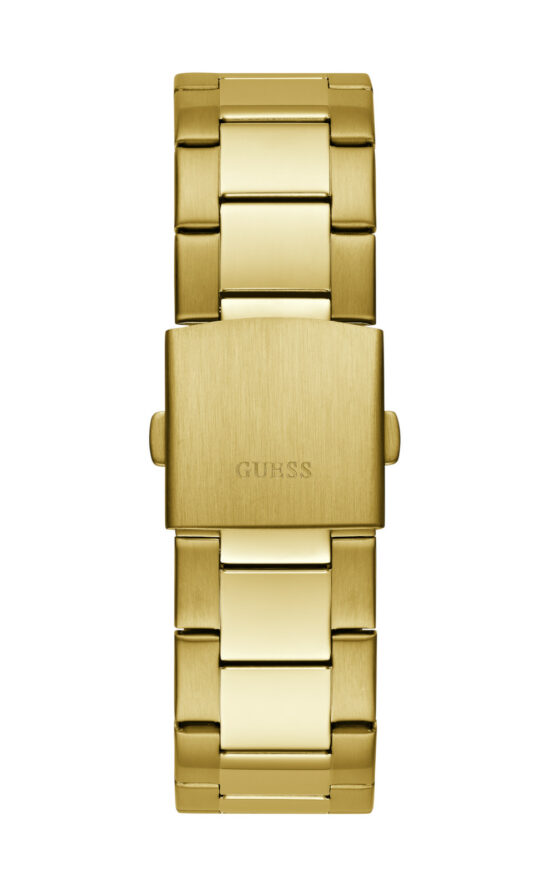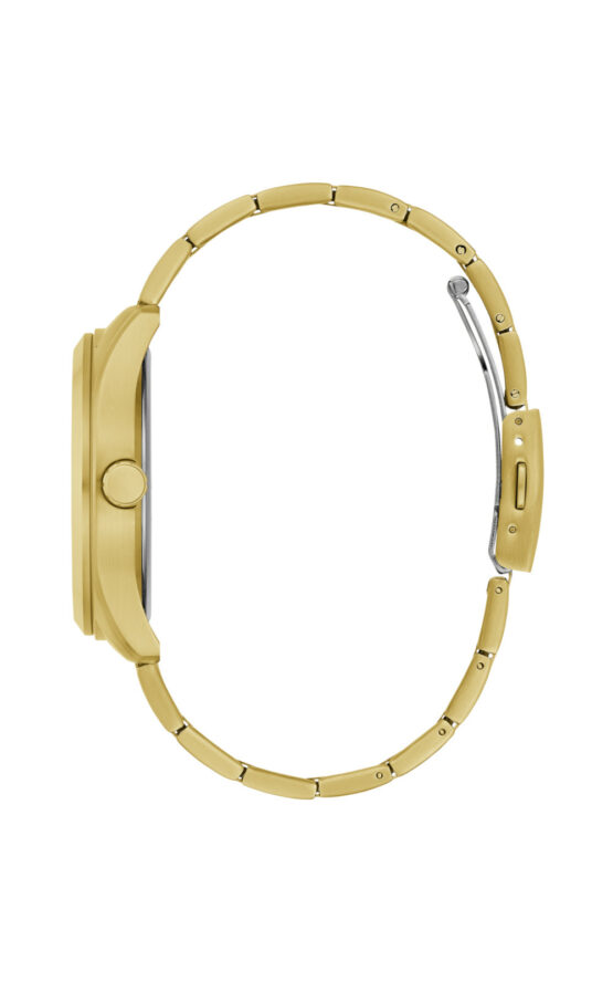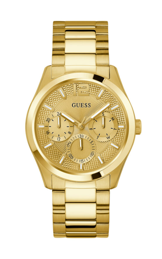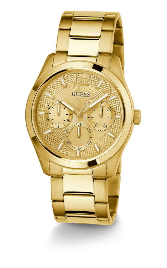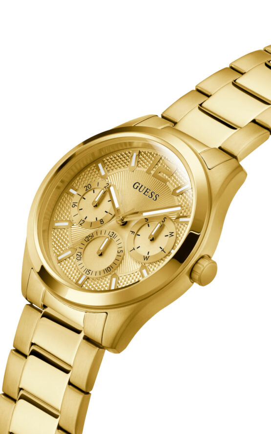 Αντρικό ρολόι GUESS ZEN GW0707G3 διαμέτρου 42mm, με μηχανισμό QUARTZ Multi-Function ακριβείας, χρύσο καντράν, χρυσή κάσα και μπρασελέ από ανοξείδωτο ατσάλι.