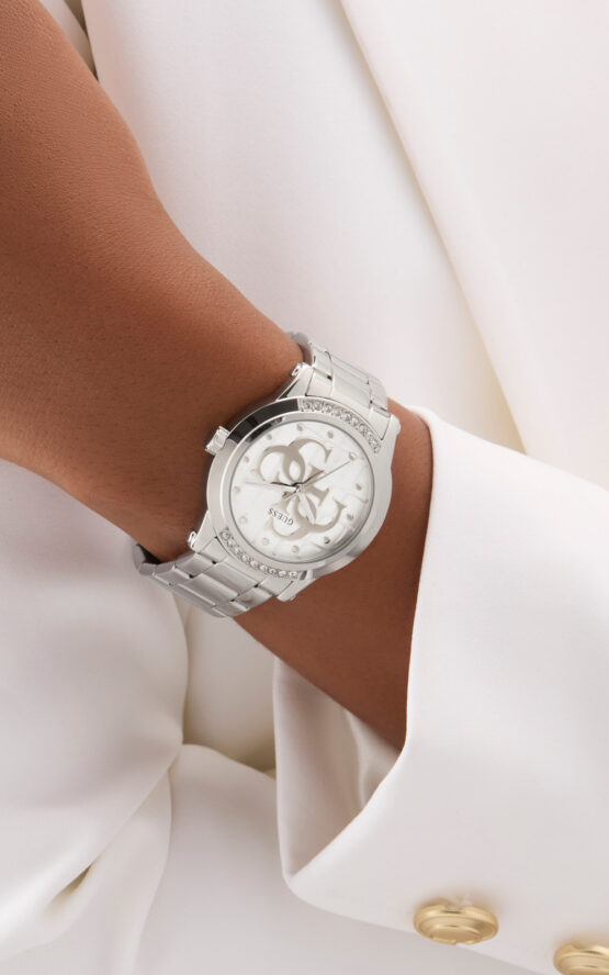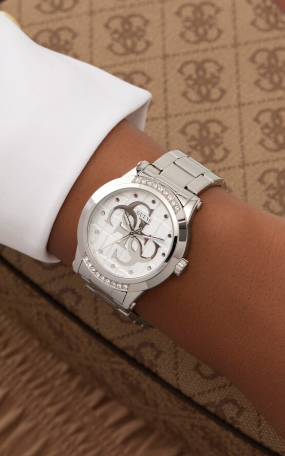 Γυναικείο ρολόι GUESS ANNETTE GW0861L1 διαμέτρου 36mm, με μηχανισμό QUARTZ ακριβείας, ασημένιο καντράν και μπρασελέ από ανακυκλωμένο ατσάλι.