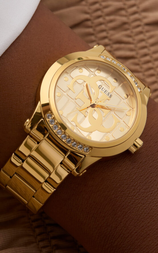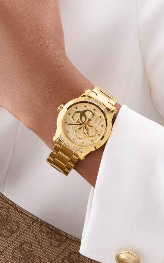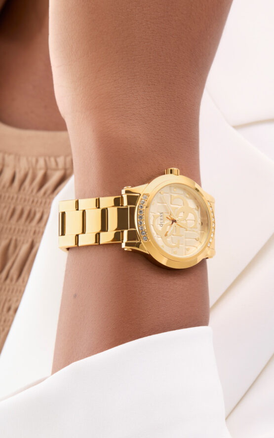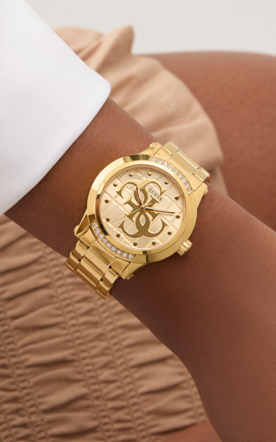 Γυναικείο ρολόι GUESS ANNETTE GW0861L2 διαμέτρου 36mm, με μηχανισμό QUARTZ ακριβείας, χρύσο καντράν και μπρασελέ από ανακυκλωμένο ατσάλι.