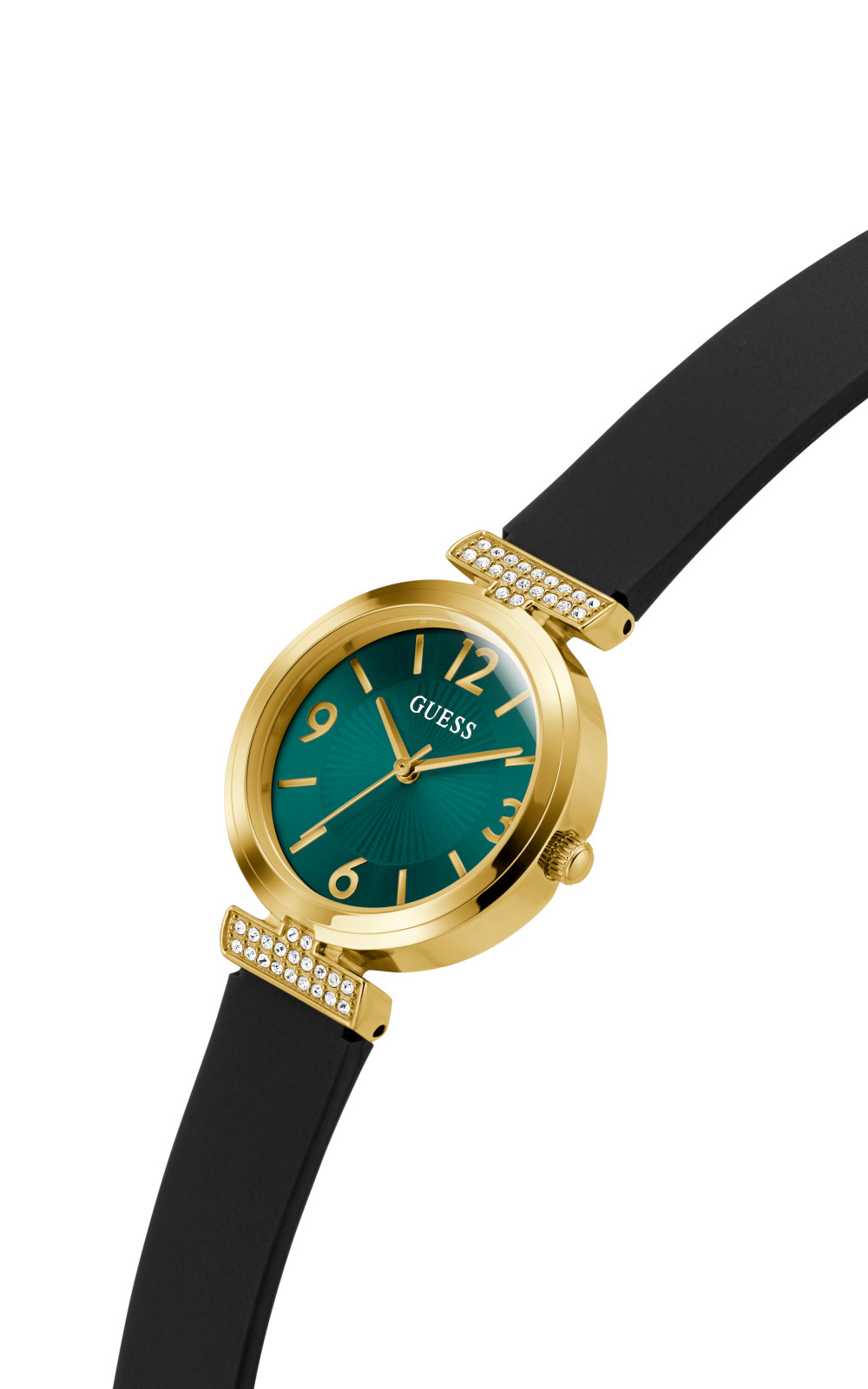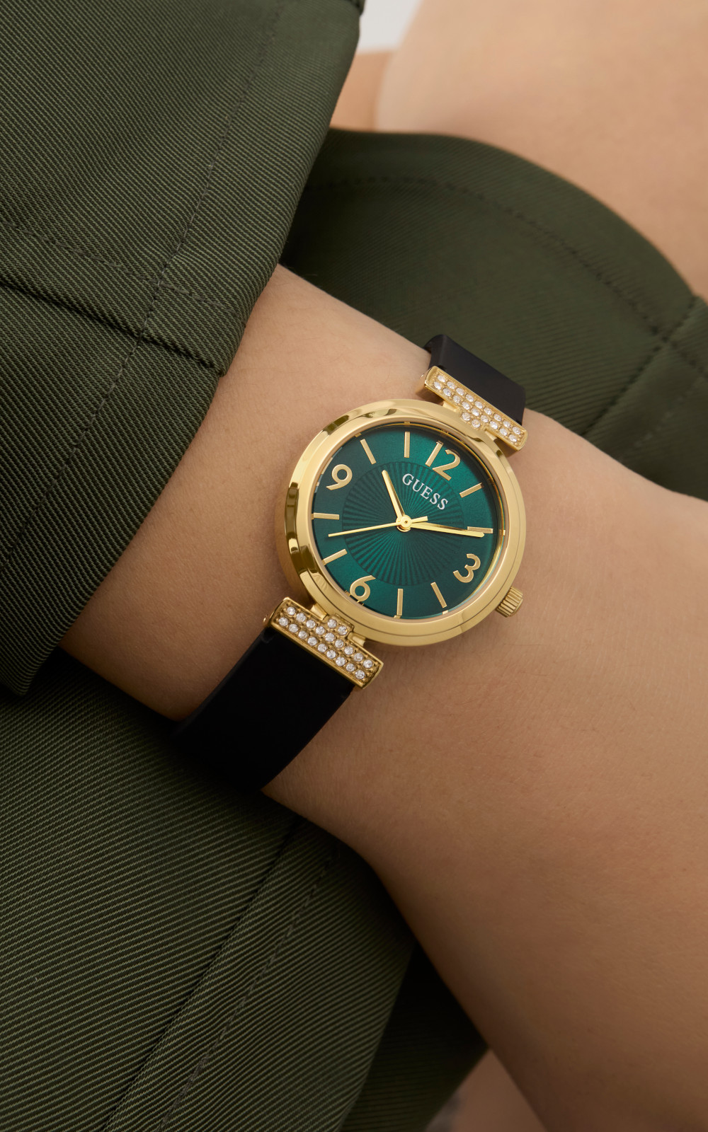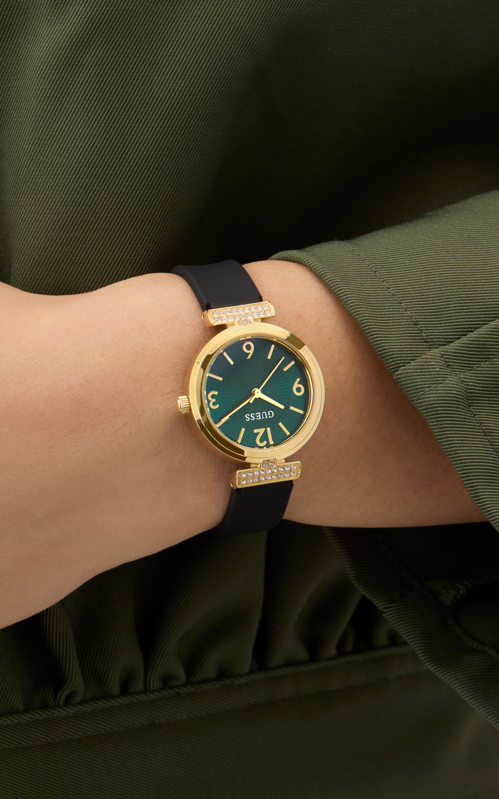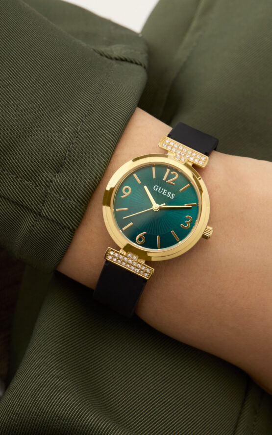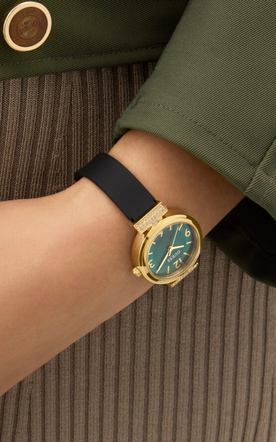 Γυναικείο ρολόι διαμέτρου 28mm με μηχανισμό QUARTZ ακριβείας. Έχει πράσινο καντράν με χρυσούς δείκτες και λεπτομέρειες και είναι διακοσμημένο με πέτρες. Η κάσα του είναι χρυσή από ανακυκλωμένο ατσάλι και έχει κρύσταλλο από ορυκτό κρύσταλλο ειδικής σκλήρυνσης. Έχει λουράκι από καουτσούκ με κούμπωμα τοκάς. Δεν είναι αδιάβροχο.