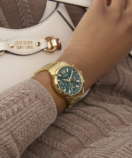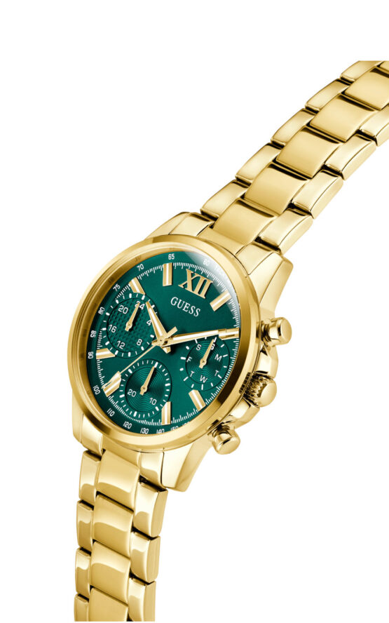 Γυναικείο ρολόι GUESS BAILEY GW0933L6 διαμέτρου 36mm, με μηχανισμό QUARTZ Multifuction ακριβείας, πράσινο καντράν, κάσα και μπρασελέ από ανακυκλωμένο ατσάλι.