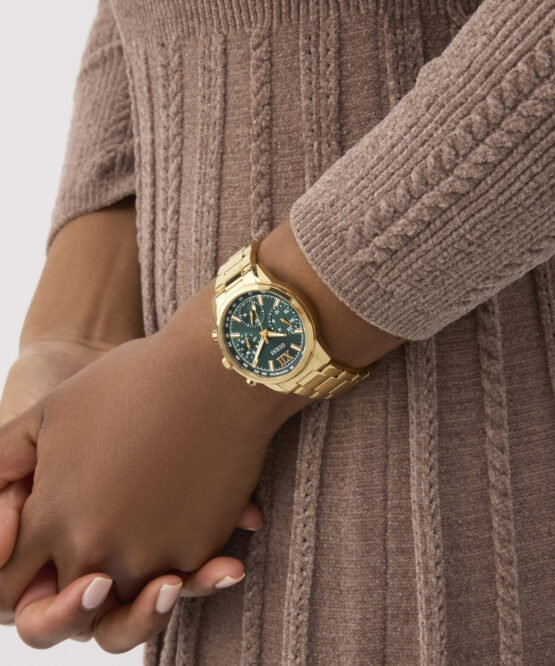 Γυναικείο ρολόι διαμέτρου 36mm με μηχανισμό QUARTZ Multifuction ακριβείας. Έχει πράσινο καντράν με χρυσούς δείκτες και λεπτομέρειες. Η κάσα του είναι από ανακυκλωμένο ατσάλι με κρύσταλλο από ορυκτό κρύσταλλο ειδικής σκλήρυνσης. Έχει μπρασελέ από ανακυκλωμένο ατσάλι και κούμπωμα ασφαλείας. Δεν είναι αδιάβροχο.