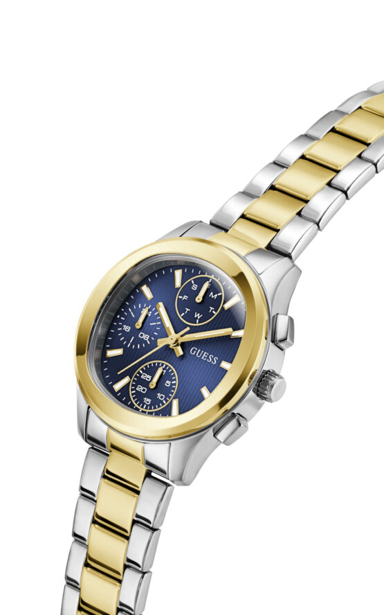 Γυναικείο ρολόι διαμέτρου 36mm με μηχανισμό QUARTZ multifuction ακριβείας. Έχει μπλε καντράν με χρυσούς δείκτες και λεπτομέρειες. Η κάσα του είναι χρυσή-ασημένια από ανακυκλωμένο ατσάλι και έχει κρύσταλλο από ορυκτό κρύσταλλο ειδικής σκλήρυνσης. Έχει μπρασελέ από ανακυκλωμένο ατσάλι με κούμπωμα ασφαλείας. Είναι αδιάβροχο (5ΑΤΜ).