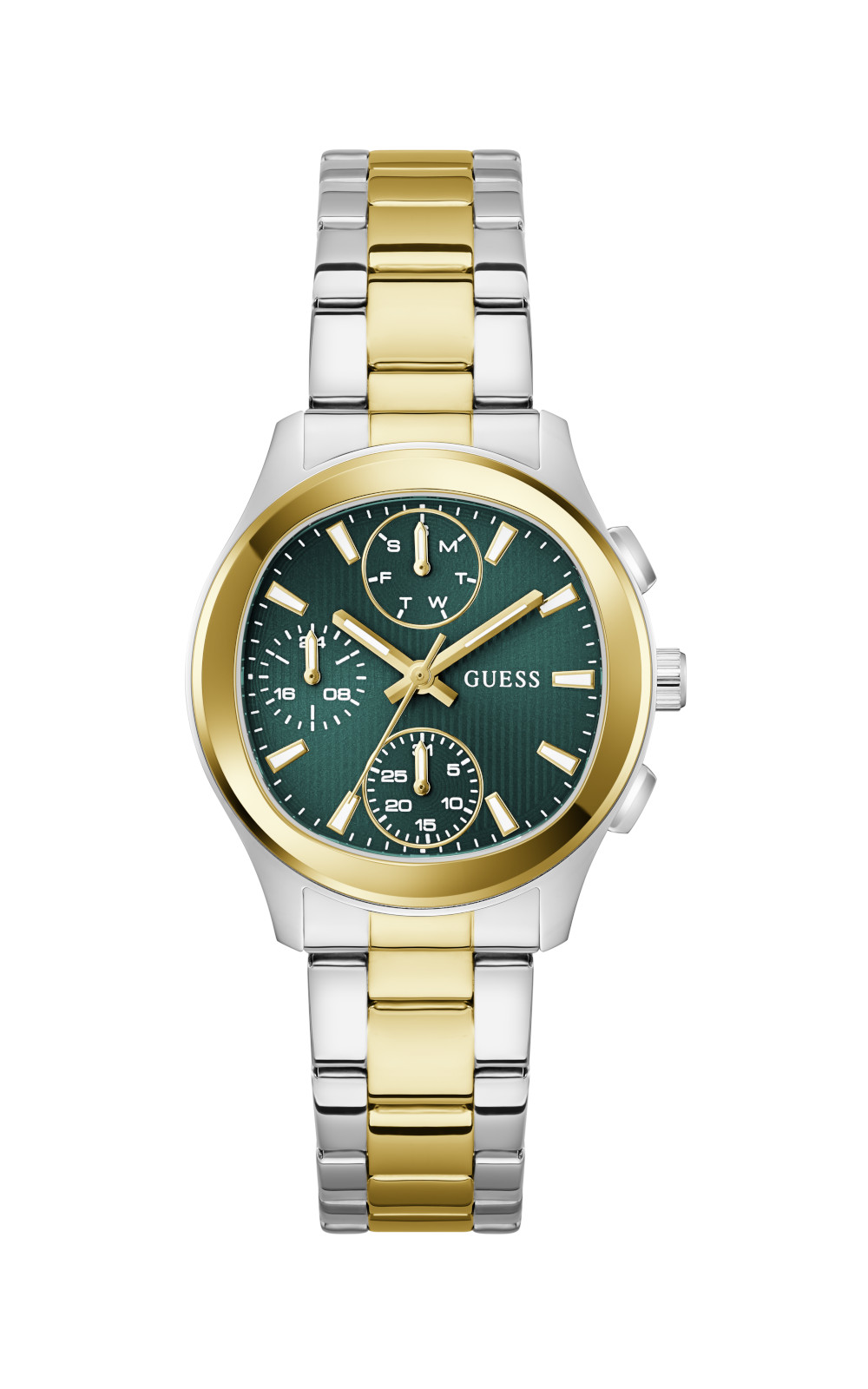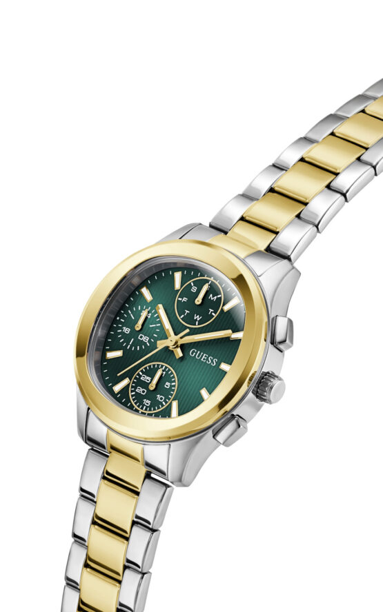 Γυναικείο ρολόι GUESS BIRDIE GW1031L6 διαμέτρου 36mm, με μηχανισμό QUARTZ multifuction ακριβείας, πράσινο καντράν,κάσα και μπρασελέ από ανακυκλωμένο ατσάλι και κούμπωμα ασφαλείας.