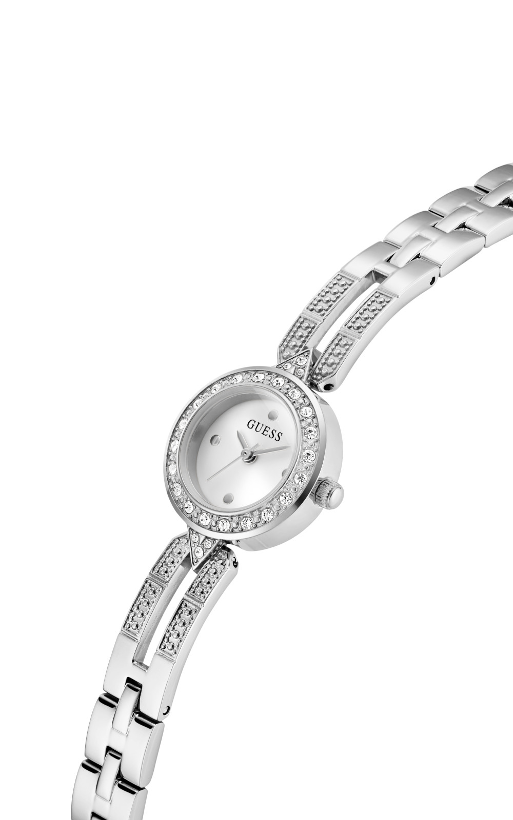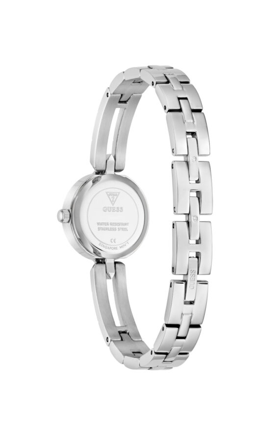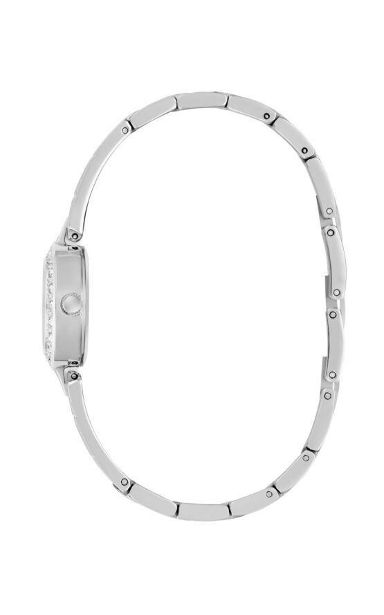 Γυναικείο ρολόι διαμέτρου 23mm με μηχανισμό QUARTZ ακριβείας. Έχει ασημί καντράν με ασημένιους δείκτες και λεπτομέρειες και είναι διακοσμημένο με πέτρες. Η κάσα του είναι ασημένια από ανακυκλωμένο ατσάλι και έχει κρύσταλλο από ορυκτό κρύσταλλο ειδικής σκλήρυνσης. Έχει μπρασελέ από ανακυκλωμένο ατσάλι με κούμπωμα G-LINK. Δεν είναι αδιάβροχο.