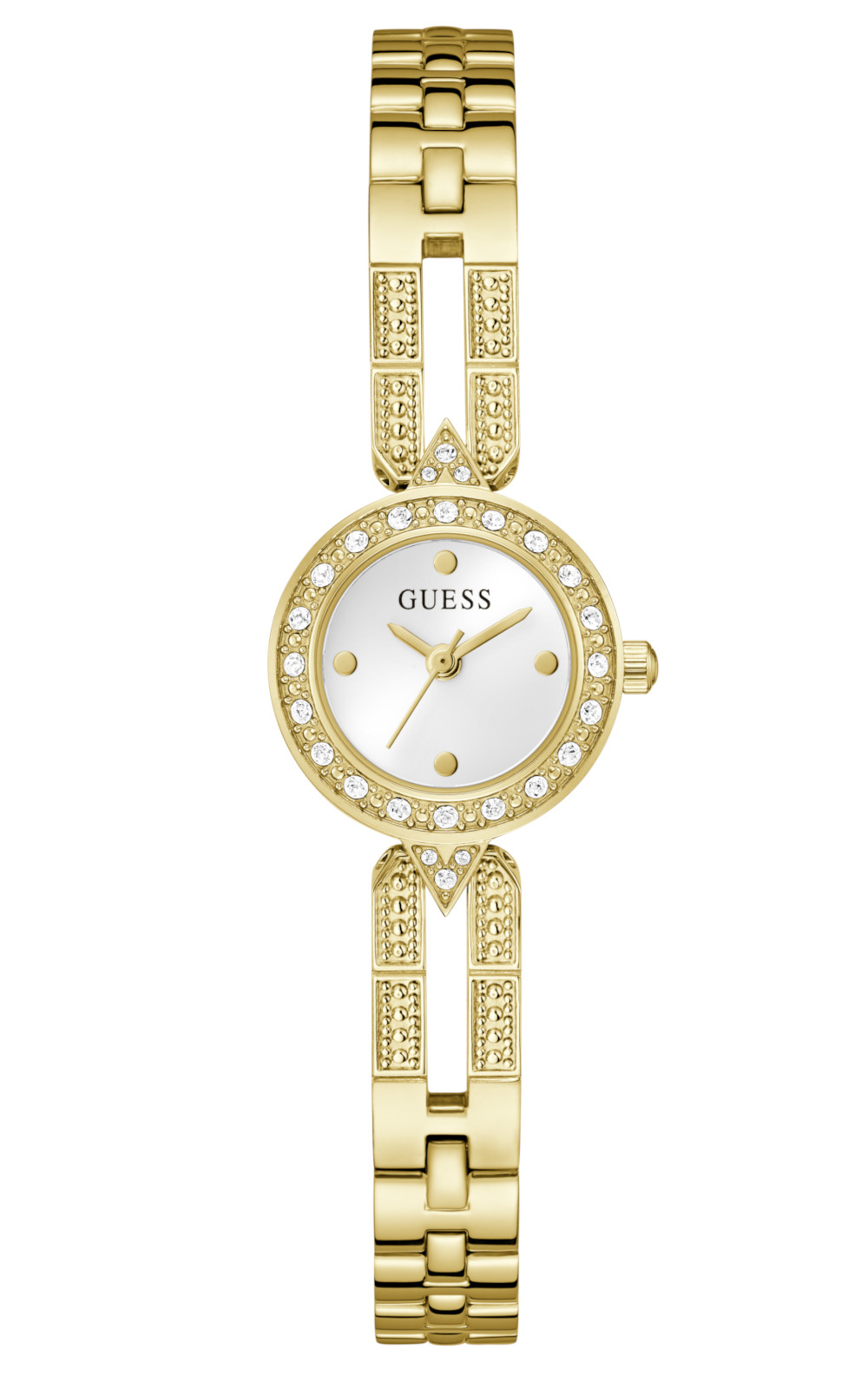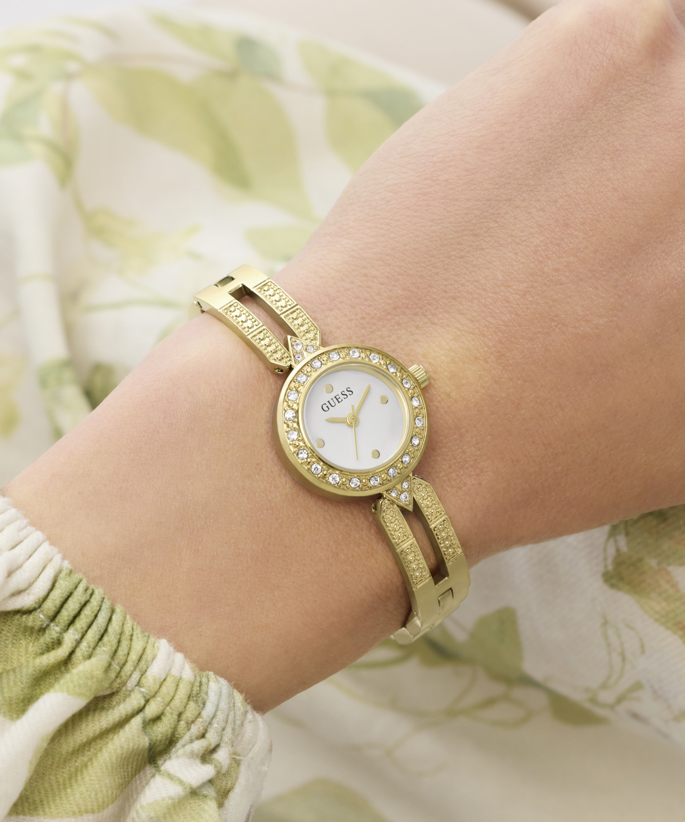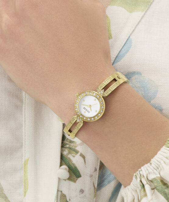 Γυναικείο ρολόι διαμέτρου 23mm με μηχανισμό QUARTZ ακριβείας. Έχει λευκό καντράν με χρυσούς δείκτες και λεπτομέρειες και είναι διακοσμημένο με πέτρες. Η κάσα του είναι χρυσή από ανακυκλωμένο ατσάλι και έχει κρύσταλλο από ορυκτό κρύσταλλο ειδικής σκλήρυνσης. Έχει μπρασελέ από ανακυκλωμένο ατσάλι με κούμπωμα G-LINK. Δεν είναι αδιάβροχο.
